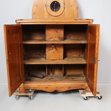 Skänk m. klocka, 1800-tal, furu, lod, pendel och vev, 105 x 44, H = 216