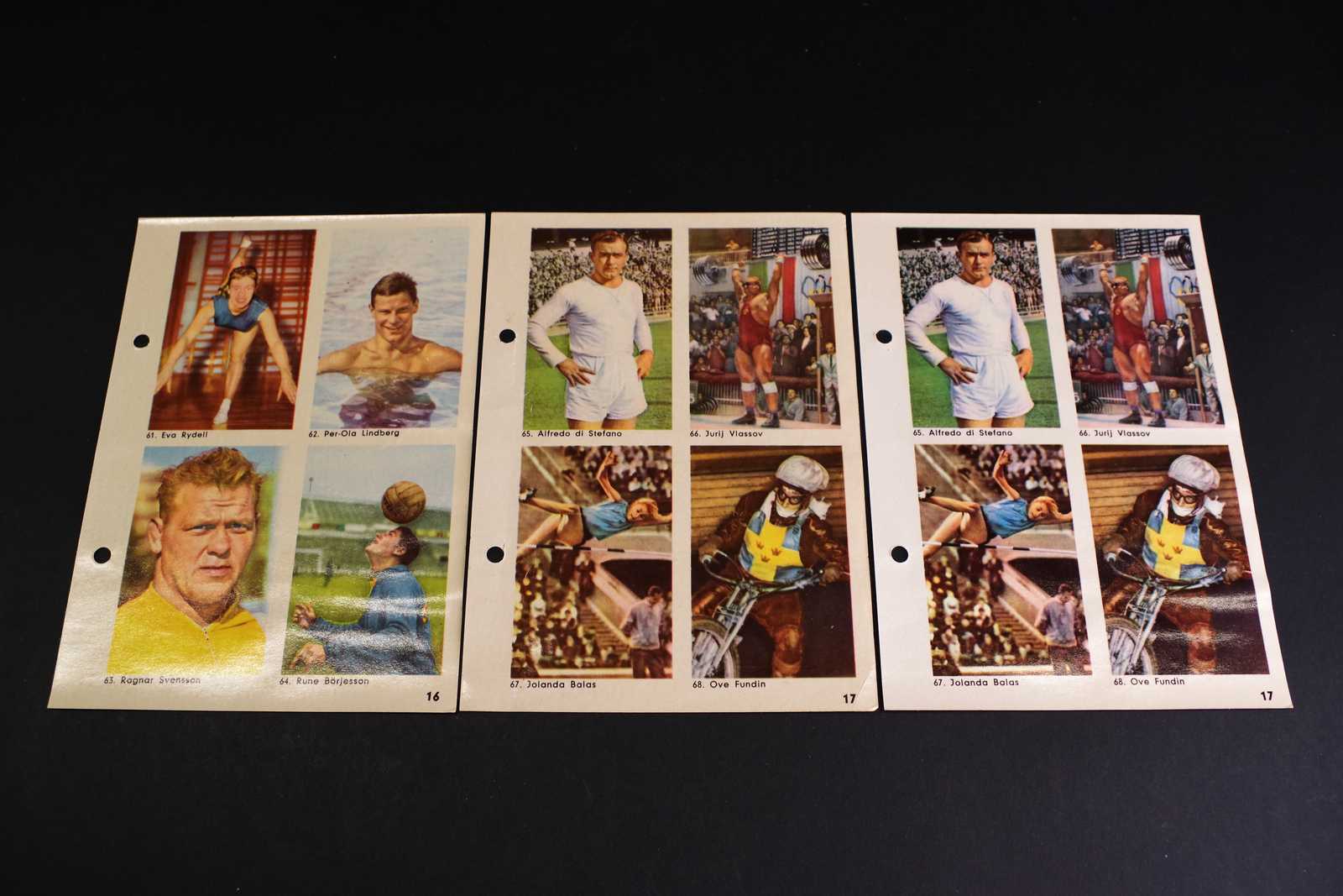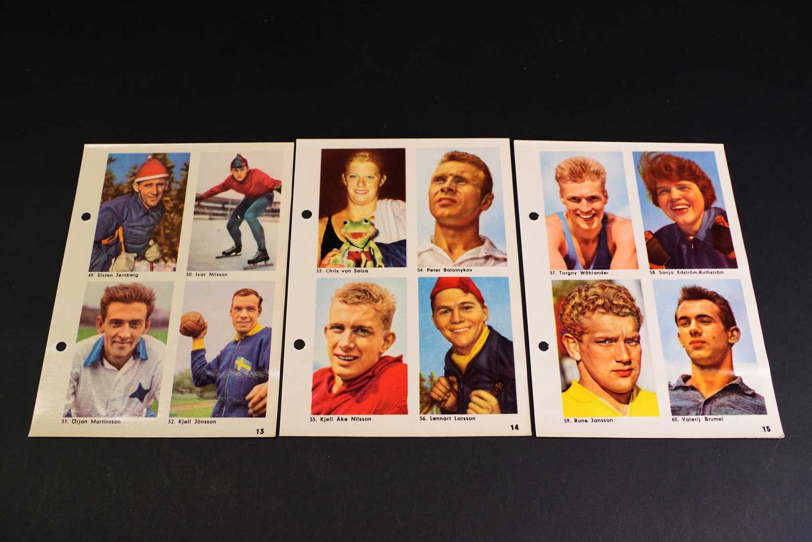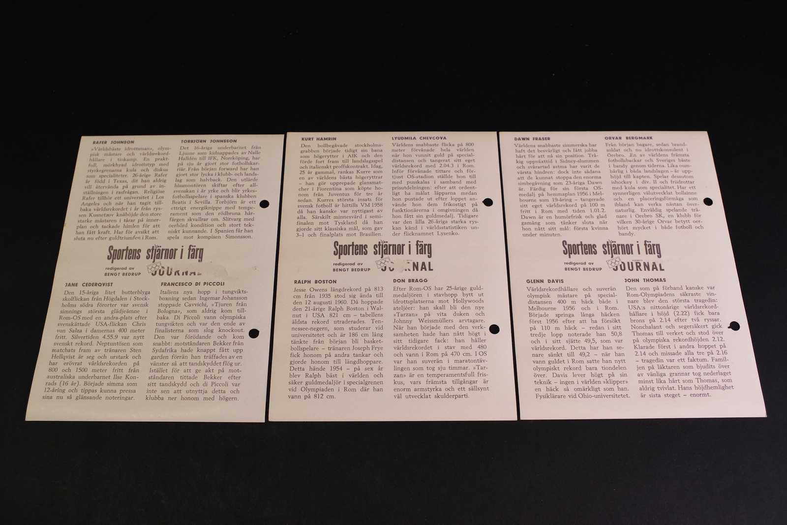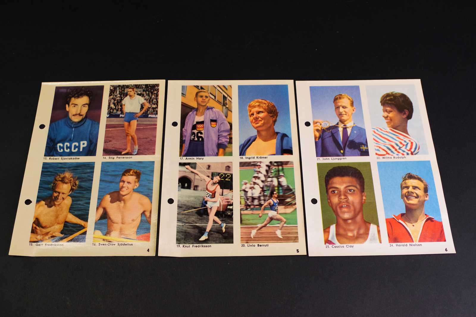 SAMLARBILDER/IDOLKORT Sportens Stjärnor Hemmets Journal innehåller 20 blad samt ett onumrerat med fyra bilder och dubblett av blad 17. Gavs ut i samband med olympiska spelen i Rom 1960 Ett av korten är Cassius Clays. Yttermått ca 16x12 cm Bra skick.