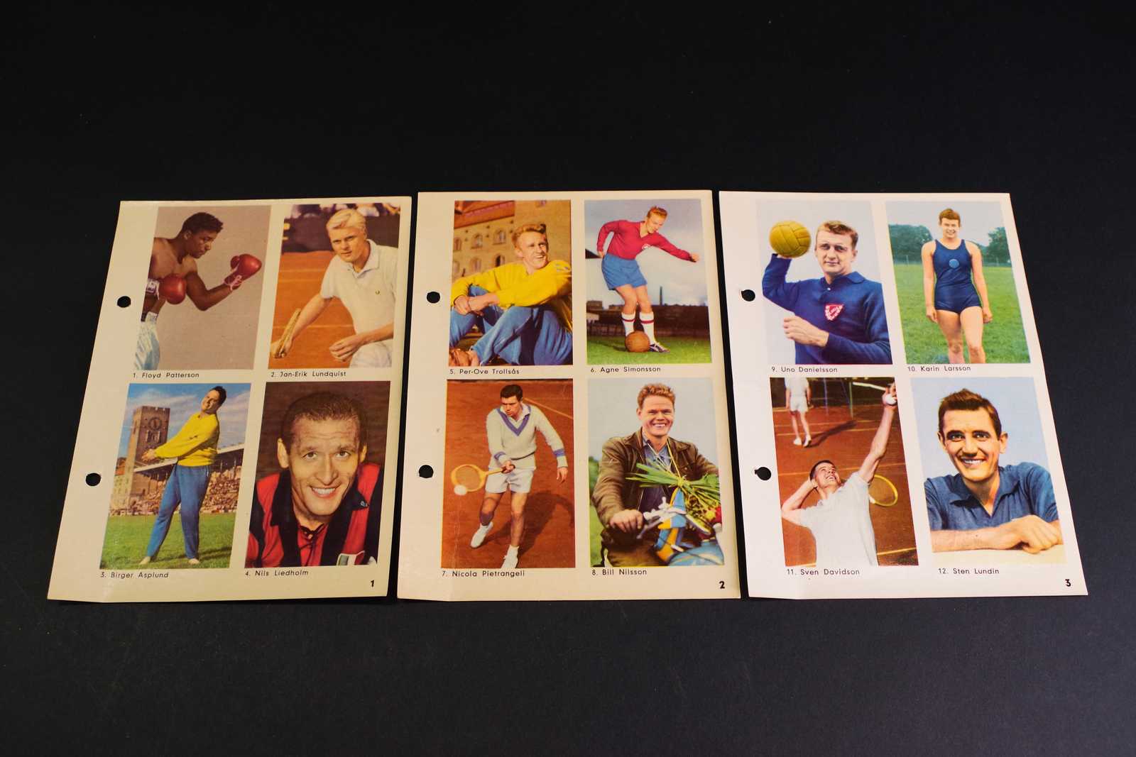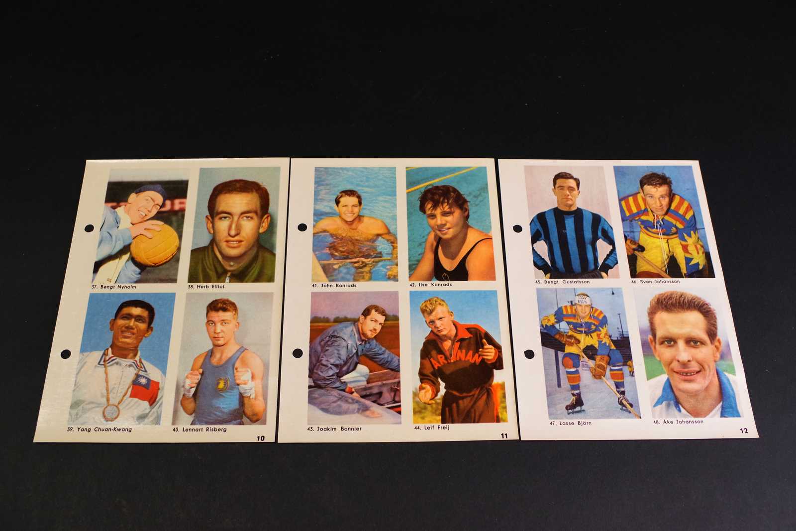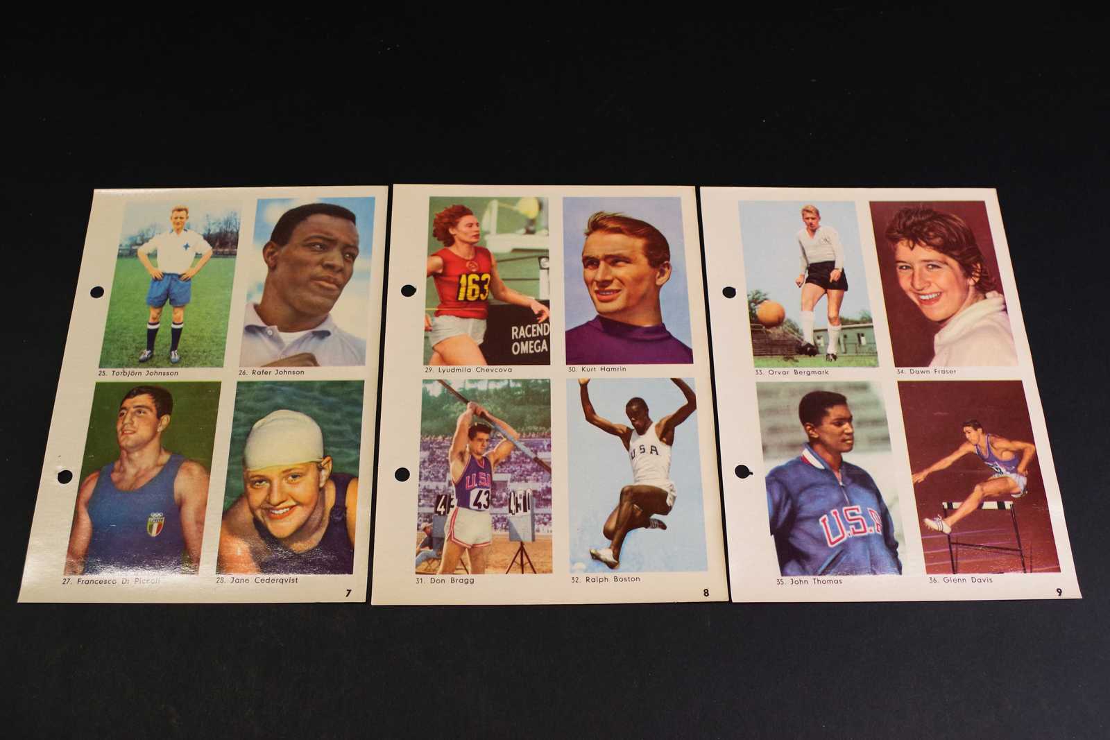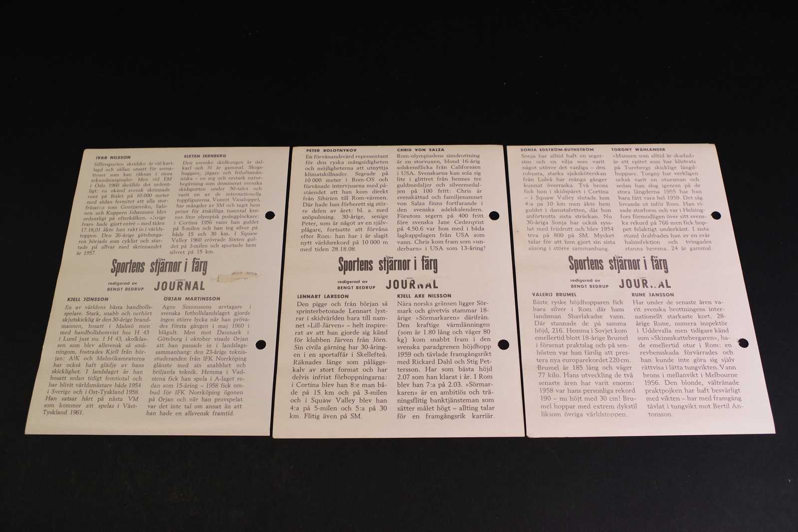 SAMLARBILDER/IDOLKORT Sportens Stjärnor Hemmets Journal innehåller 20 blad samt ett onumrerat med fyra bilder och dubblett av blad 17. Gavs ut i samband med olympiska spelen i Rom 1960 Ett av korten är Cassius Clays. Yttermått ca 16x12 cm Bra skick.