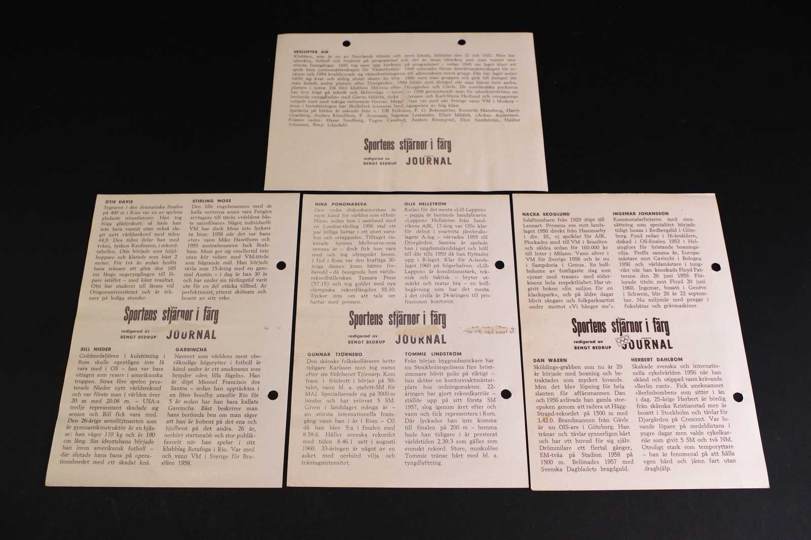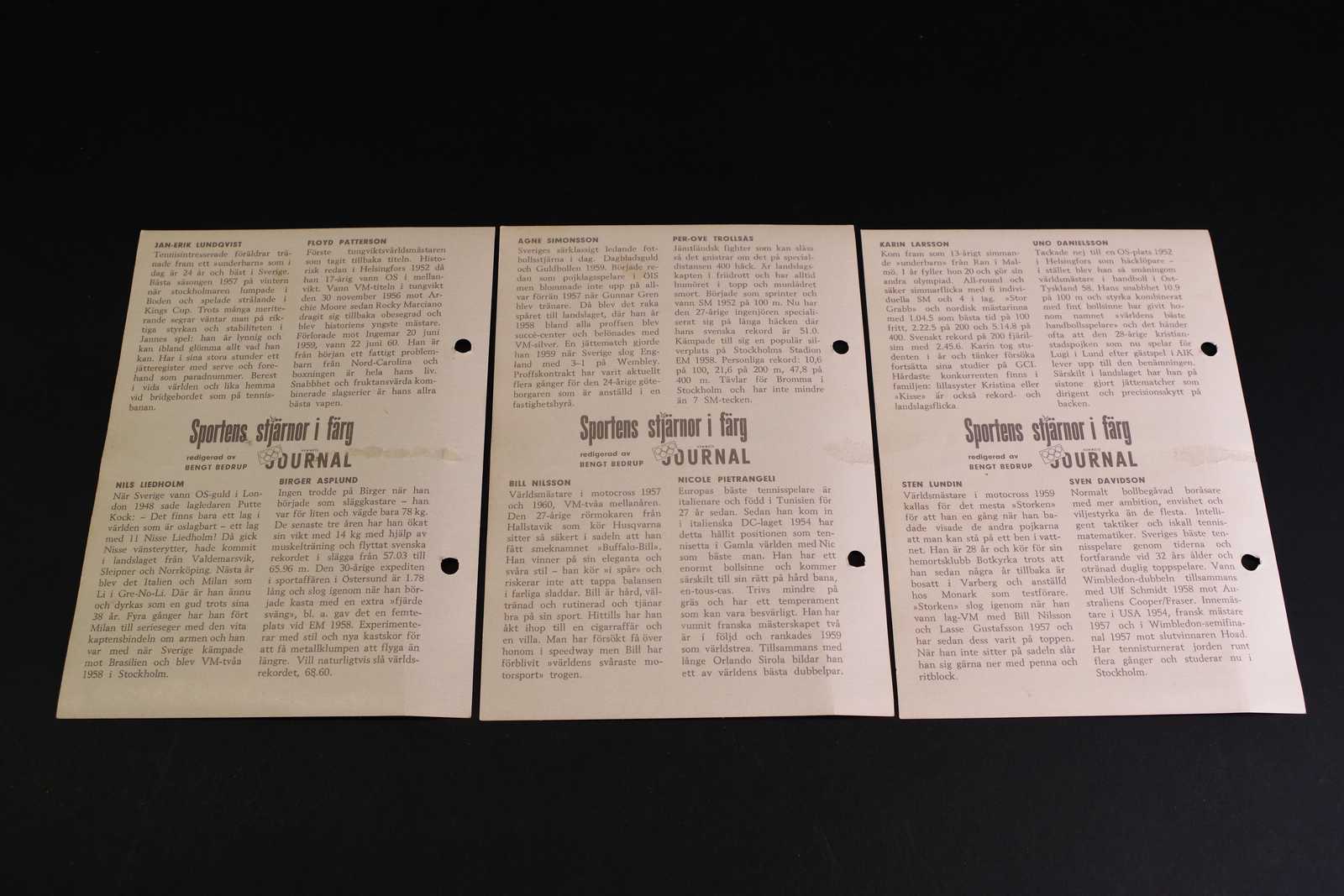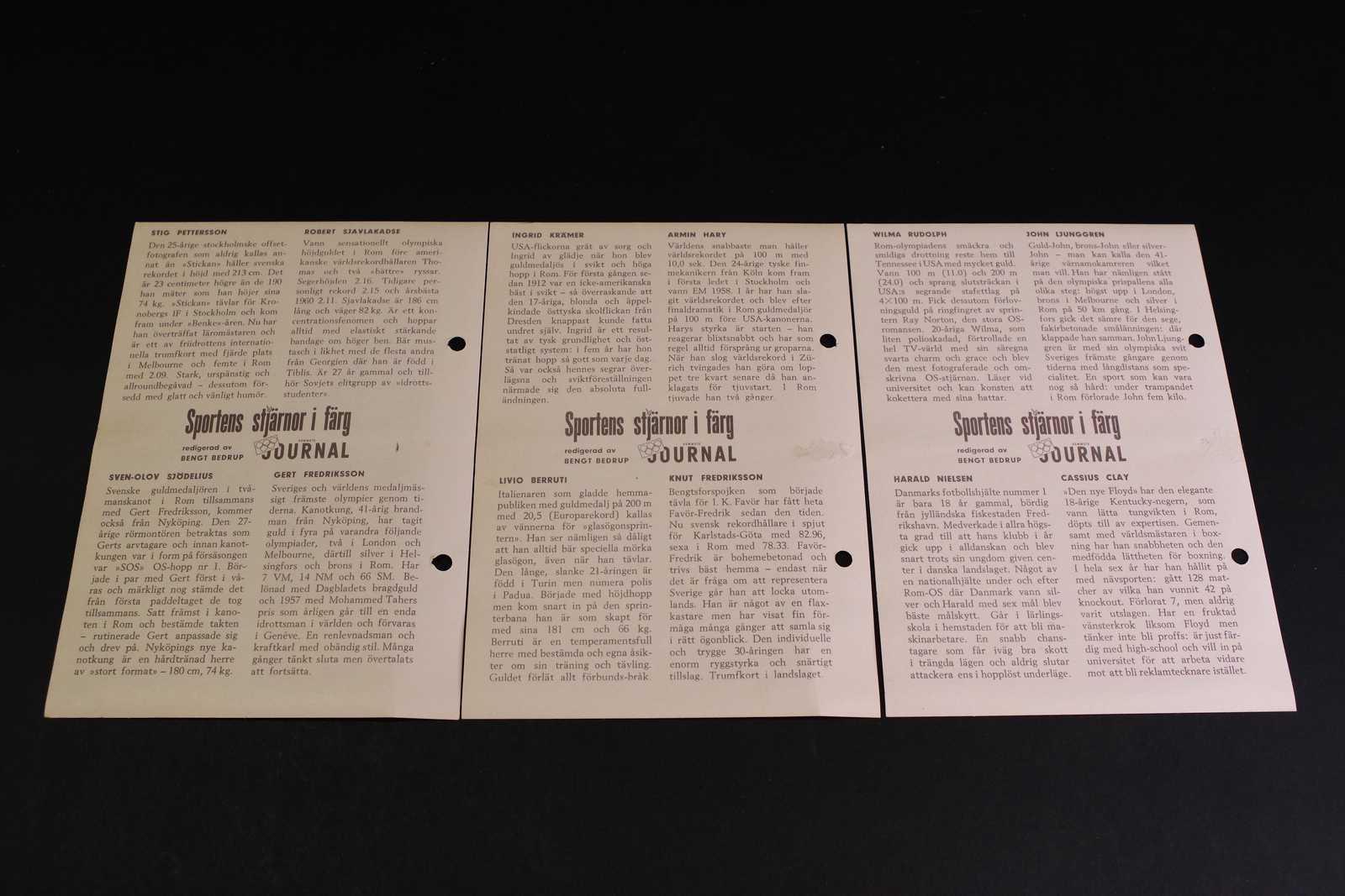 Bilder SAMLARBILDER/IDOLKORT Sportens Stjärnor Hemmets Journal innehåller 20 blad samt ett onumrerat med fyra bilder och dubblett av blad 17. Gavs ut i samband med olympiska spelen i Rom 1960 Ett av korten är Cassius Clays. Yttermått ca 16x12 cm Bra skick.