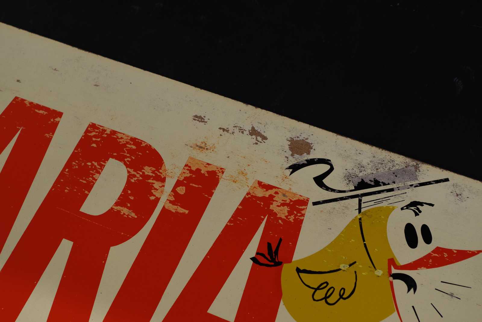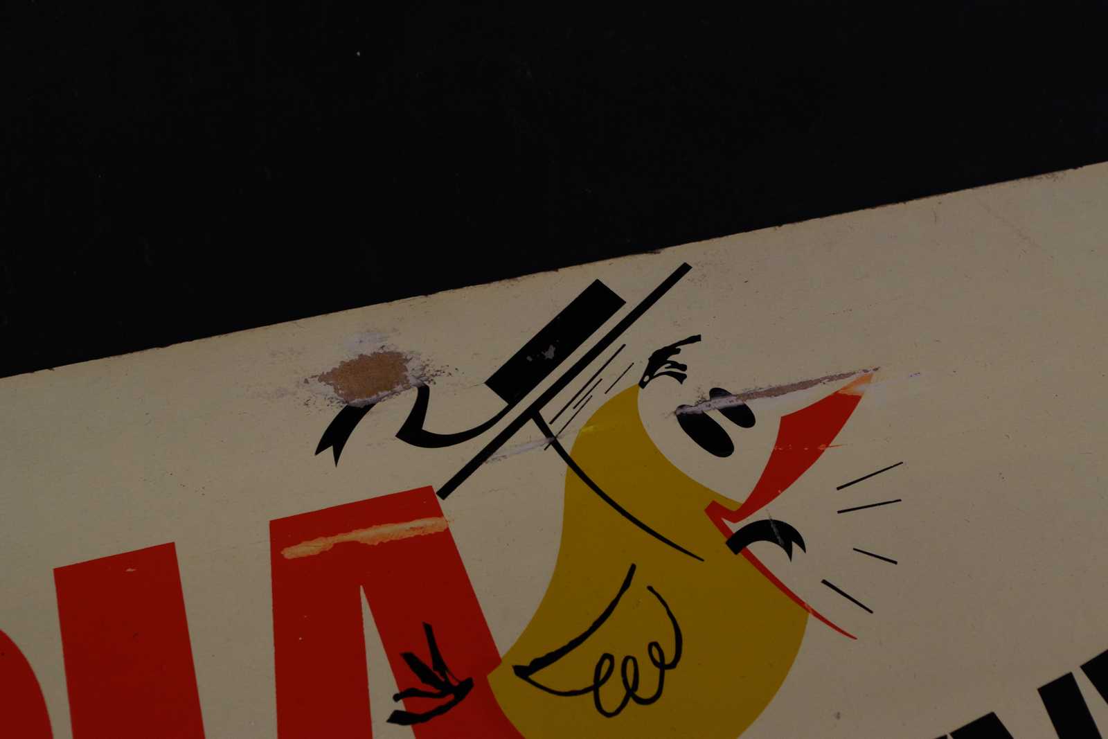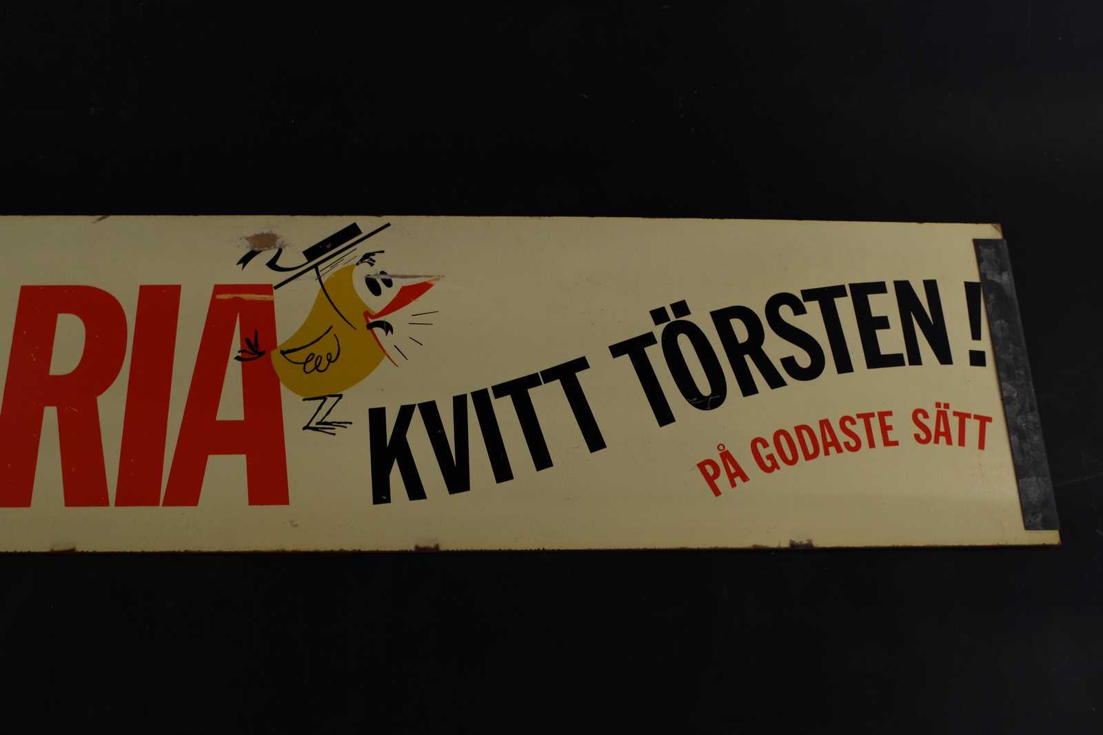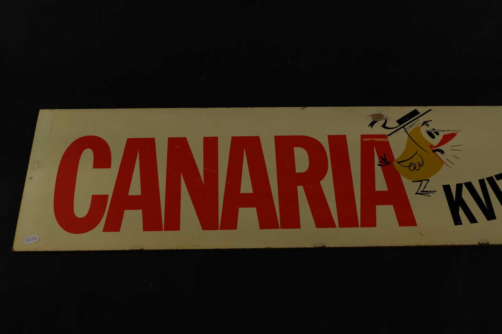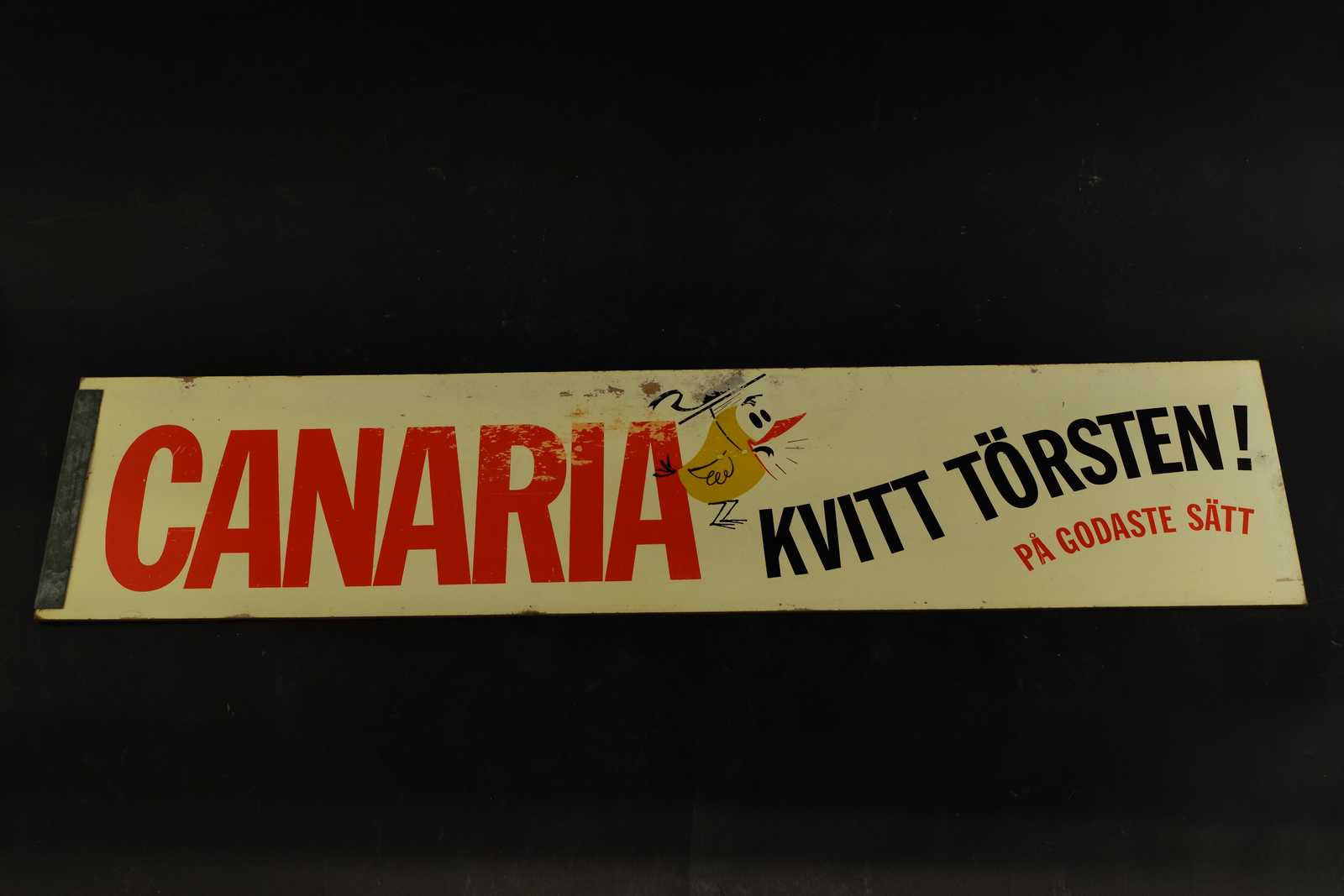 Bilder REKLAMSKYLT Canaria, tvåsidig, tryckt på masonit, 1900 talets mitt. 110x25cm (slitage, repor)