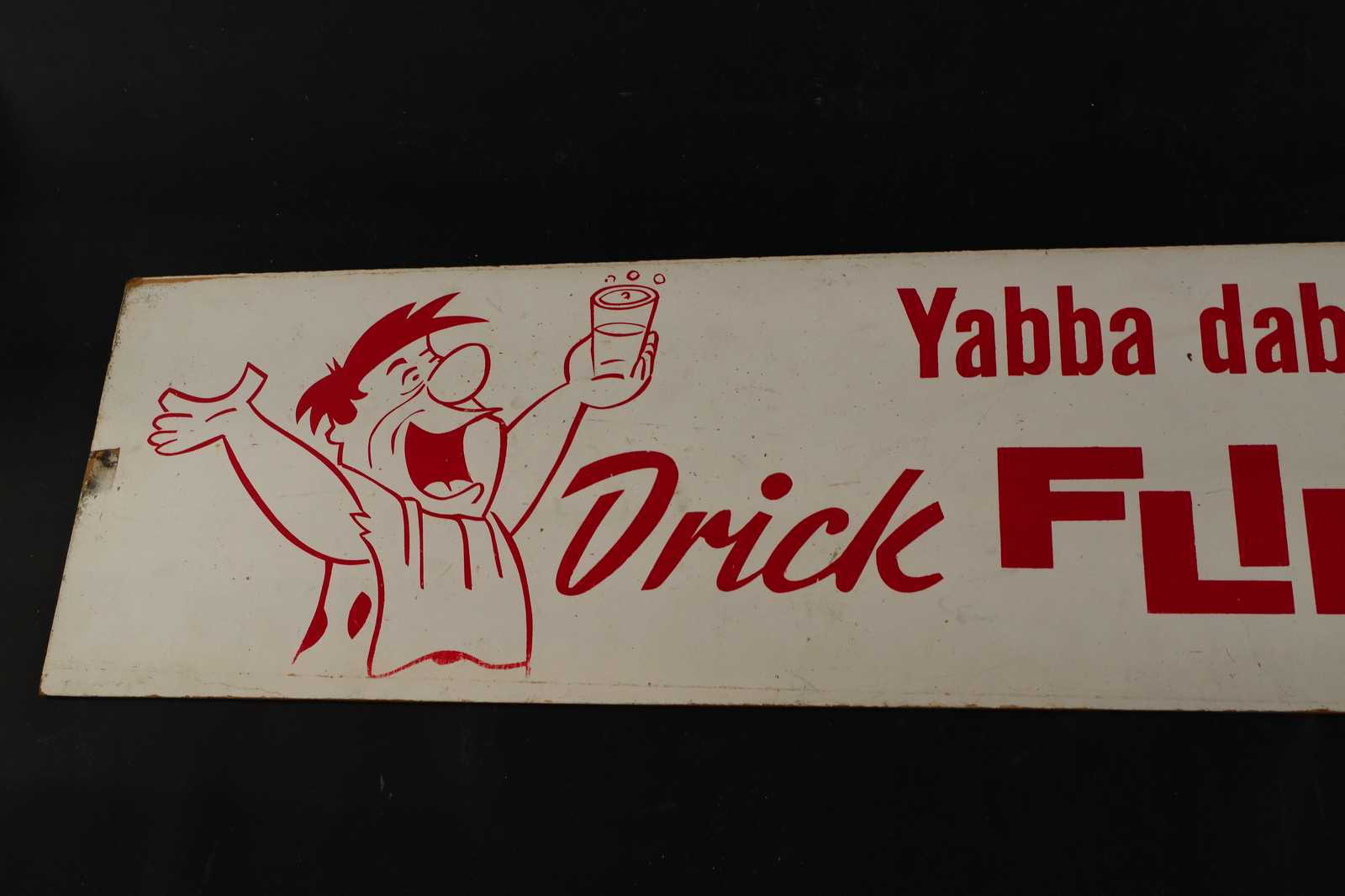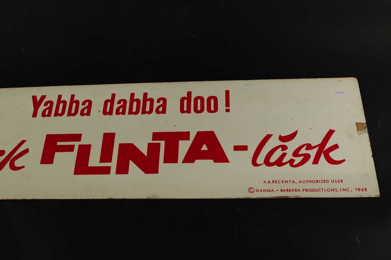 Bilder REKLAMSKYLT Flinta, ensidig, tryckt på masonit, 1900 talets mitt. 110x25cm (slitage, färgbortfall, märken)