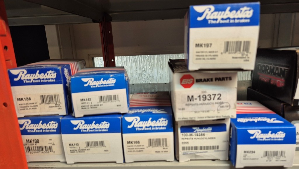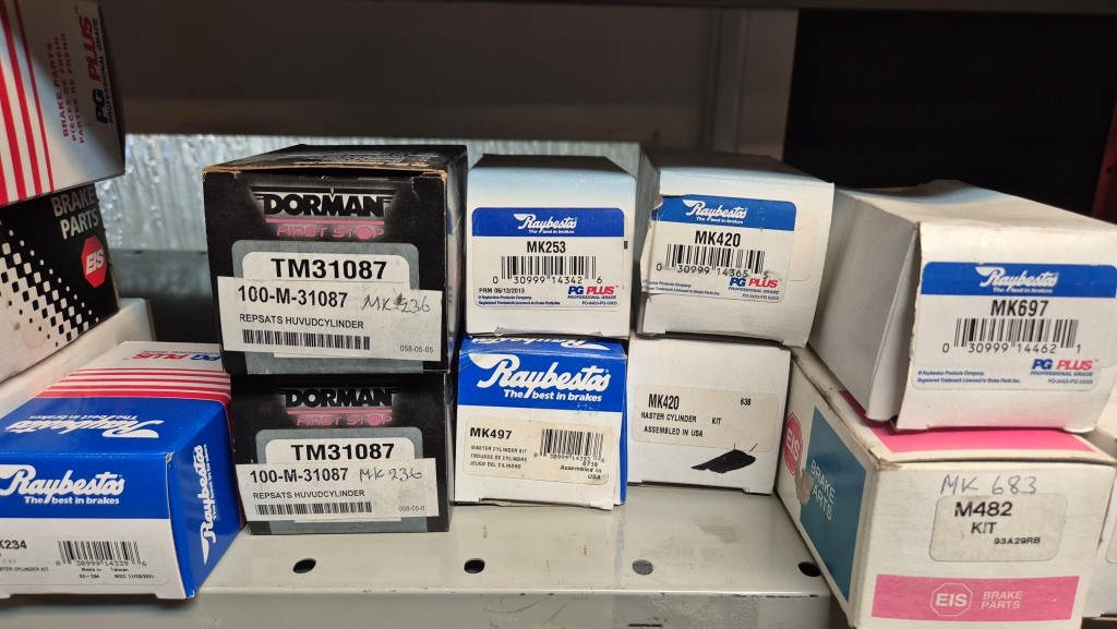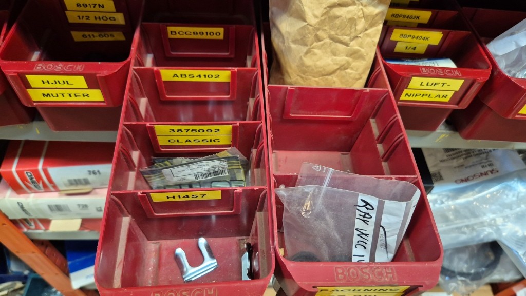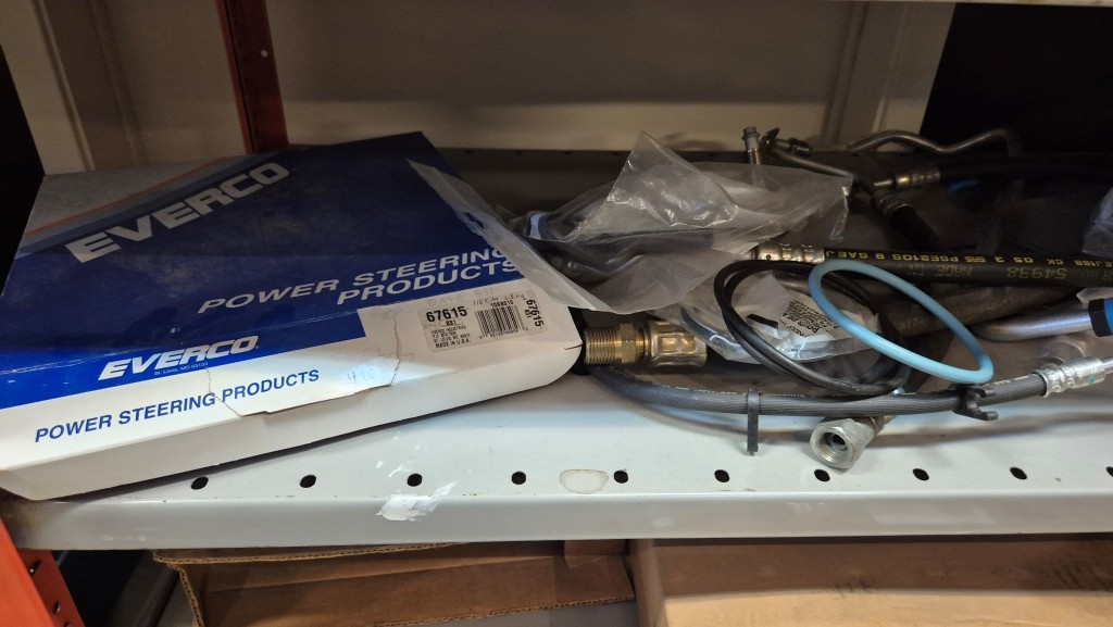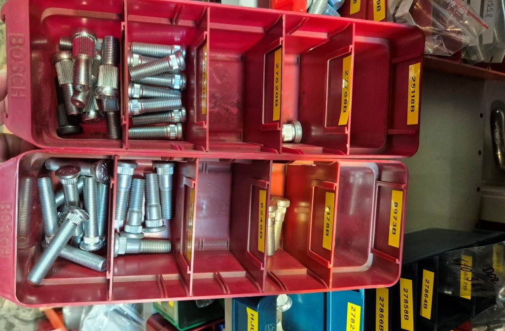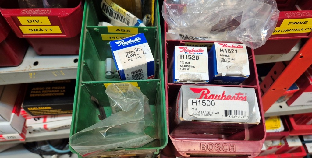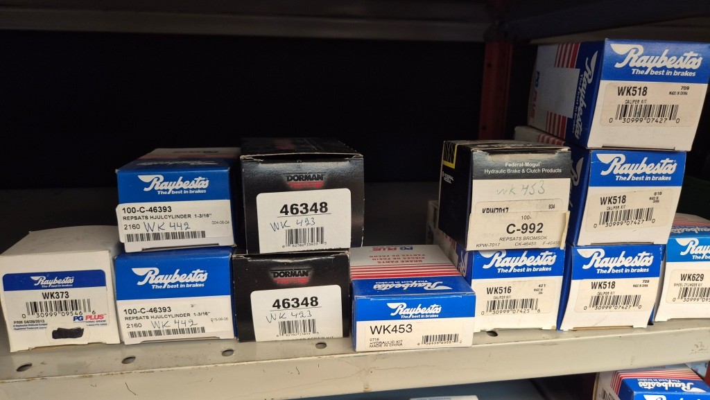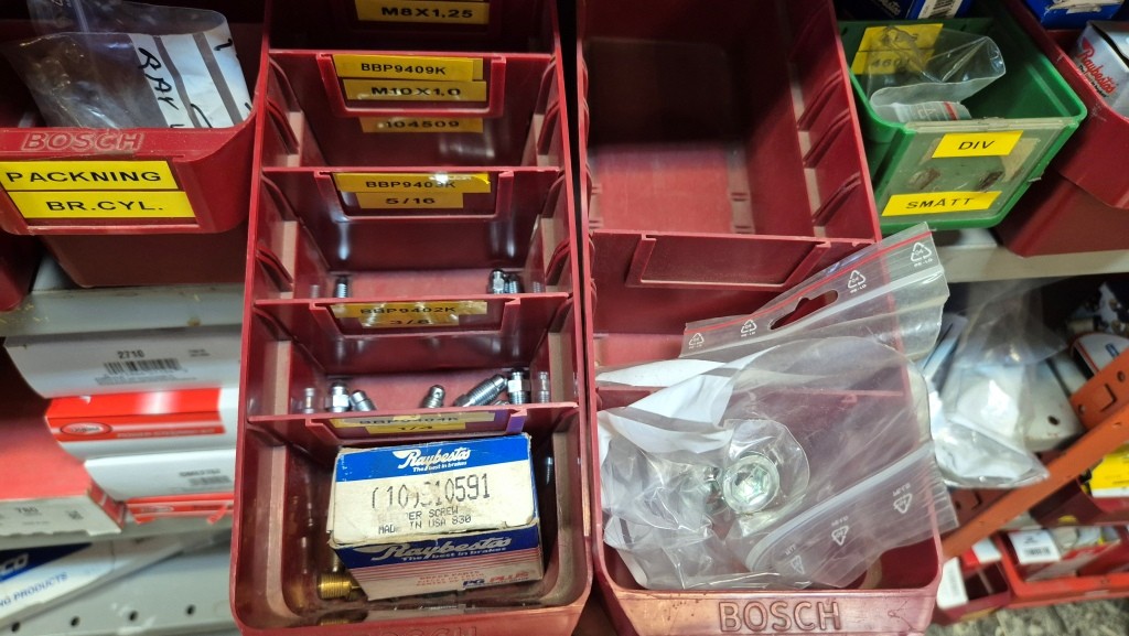 Parti med reperationssatser, bromsok, knutkurs, hjulbult, rep.satser servostyrning m.m.