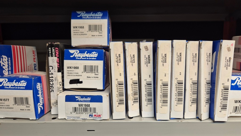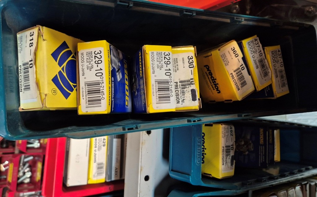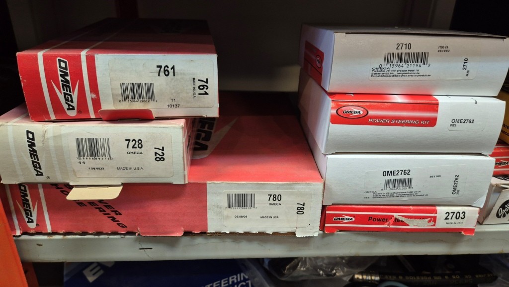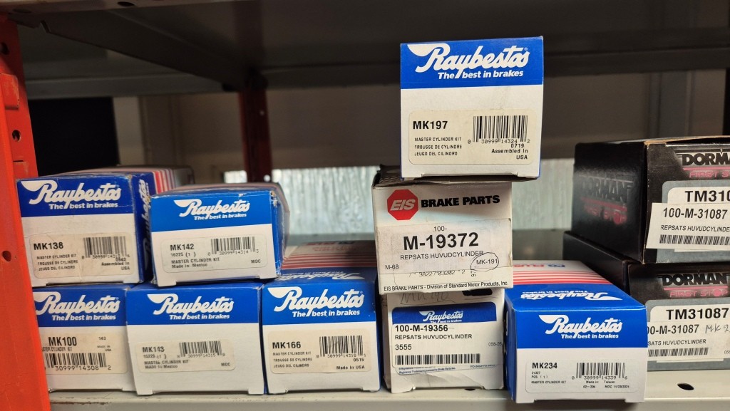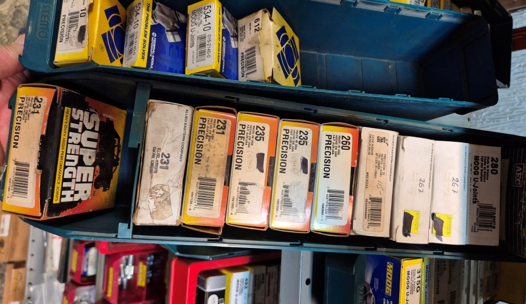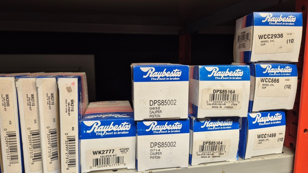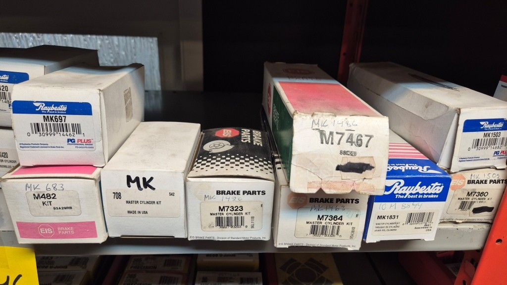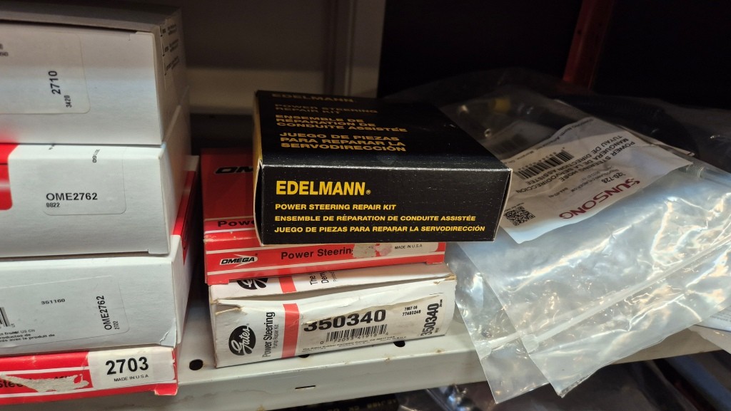 Parti med reperationssatser, bromsok, knutkurs, hjulbult, rep.satser servostyrning m.m.