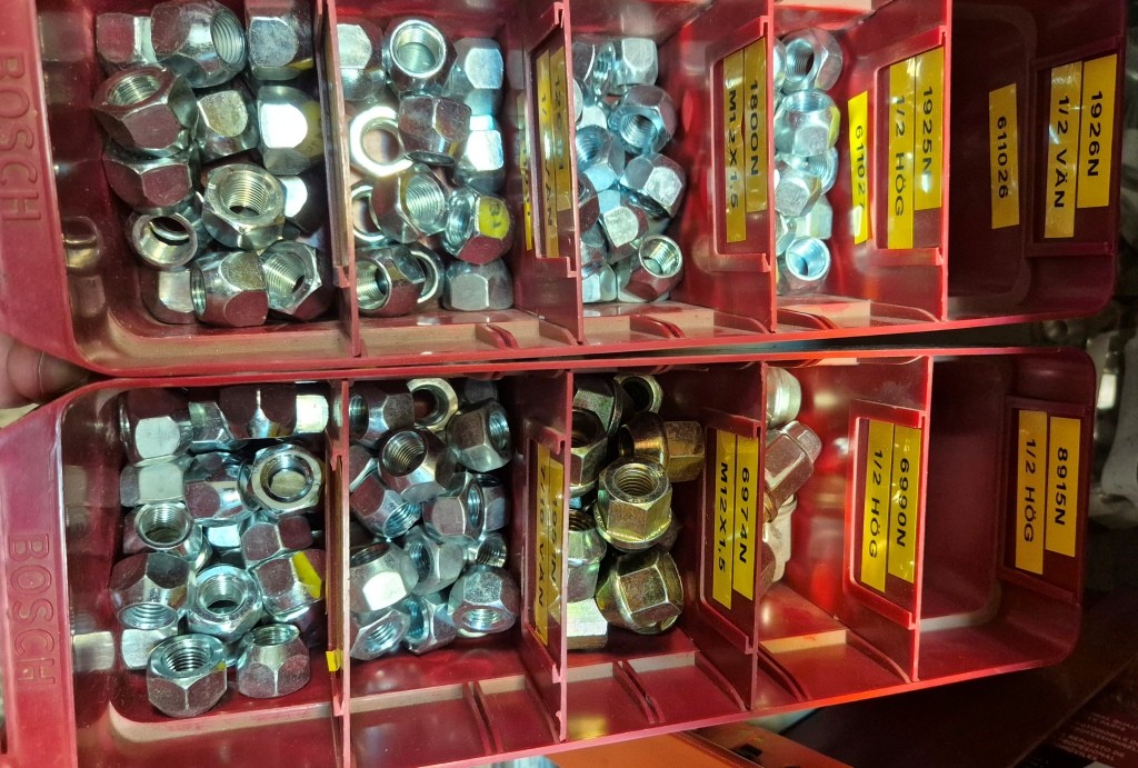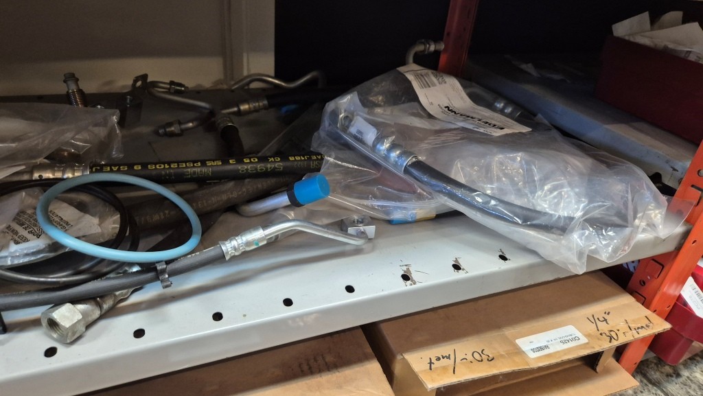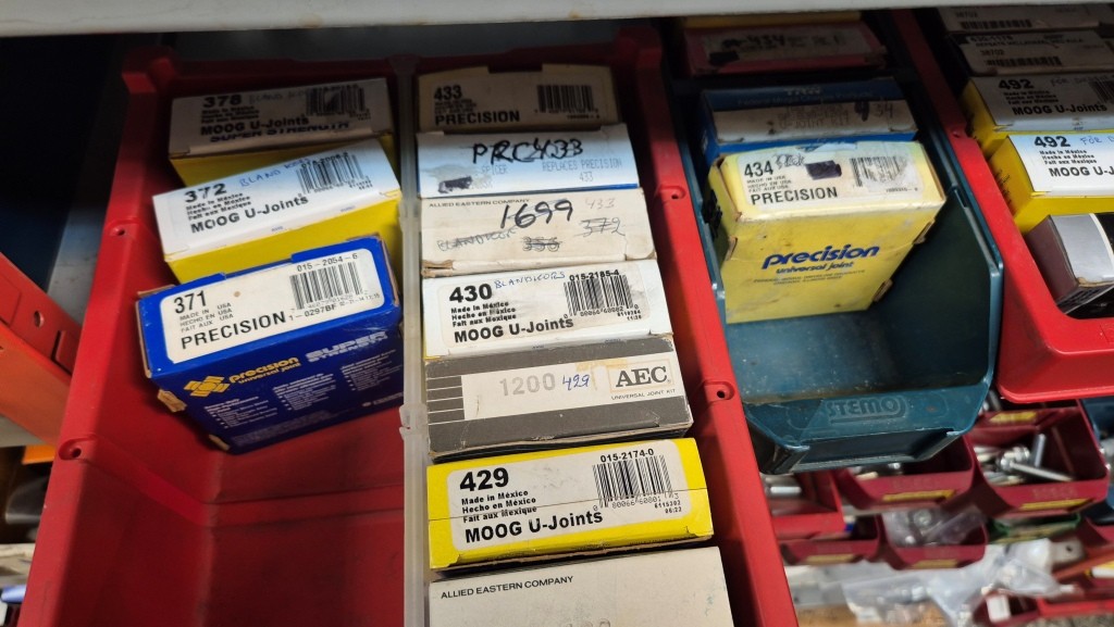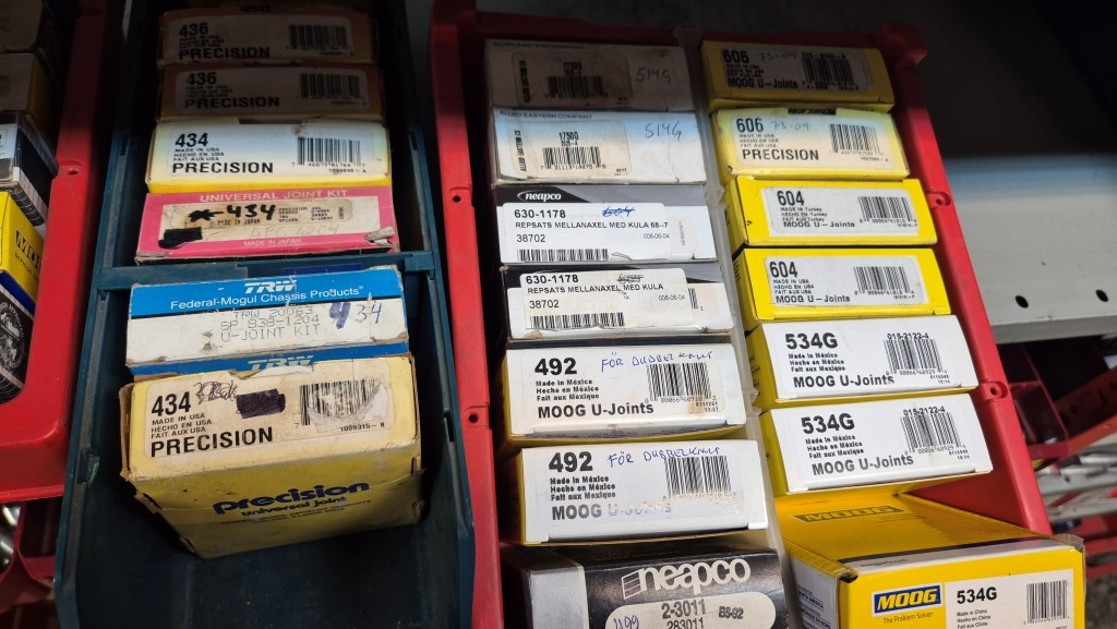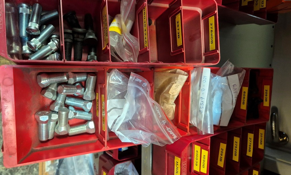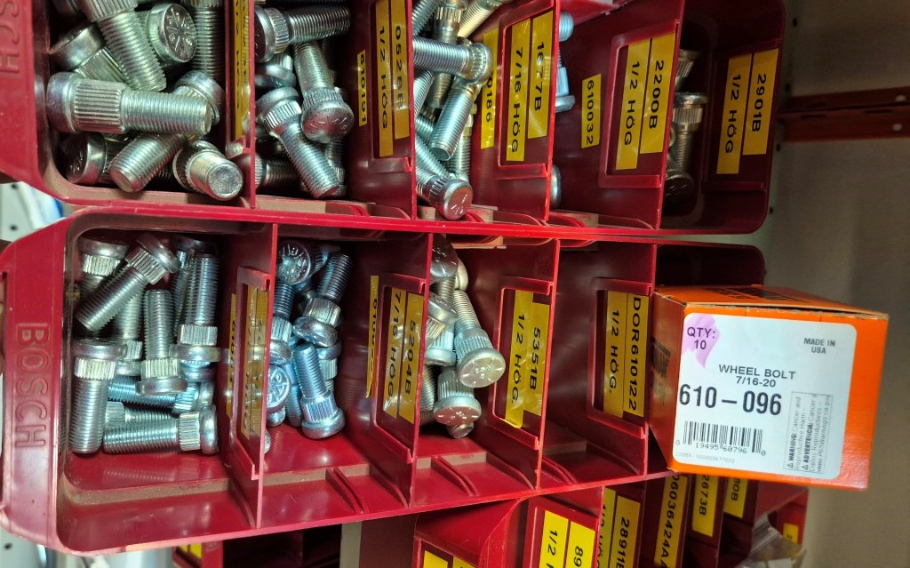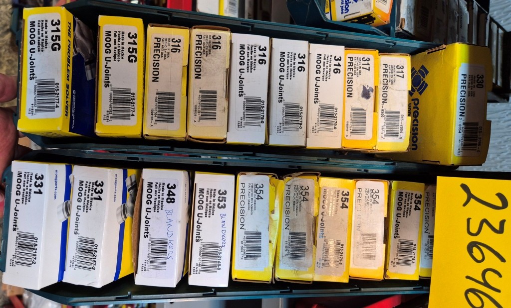 Parti med reperationssatser, bromsok, knutkurs, hjulbult, rep.satser servostyrning m.m.