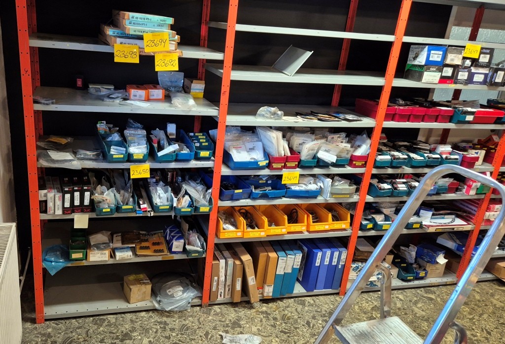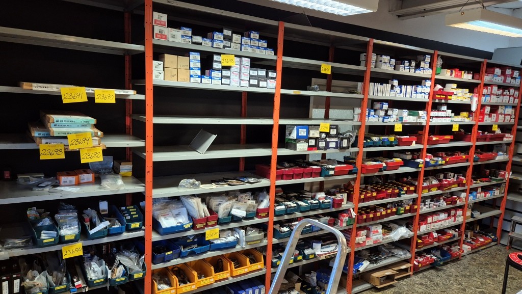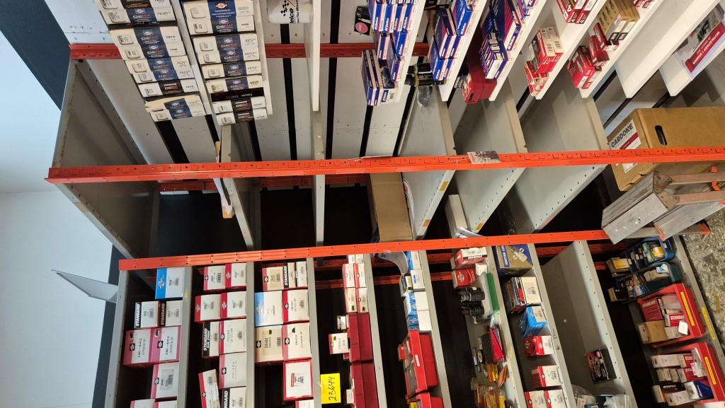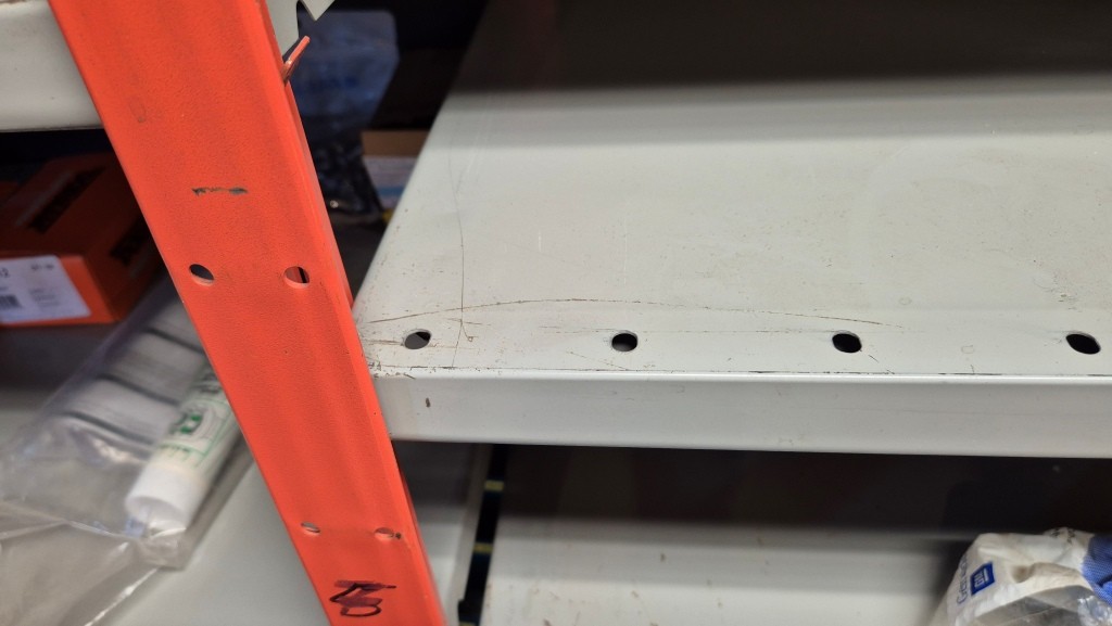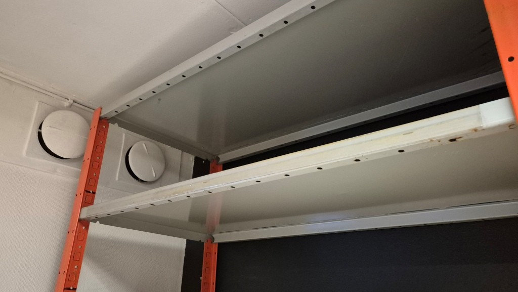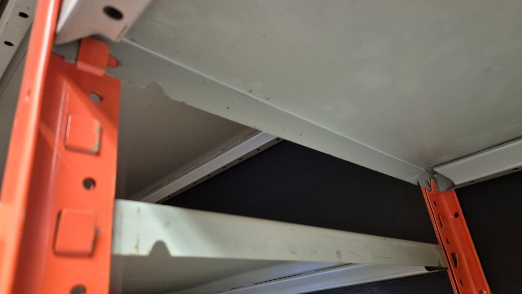 Lagerhylla i plåt (innehåll ingår ej)66st hyllplan 50x100cm22st ben höjd 250cmMöjligt att bygga 8sektioner hylla