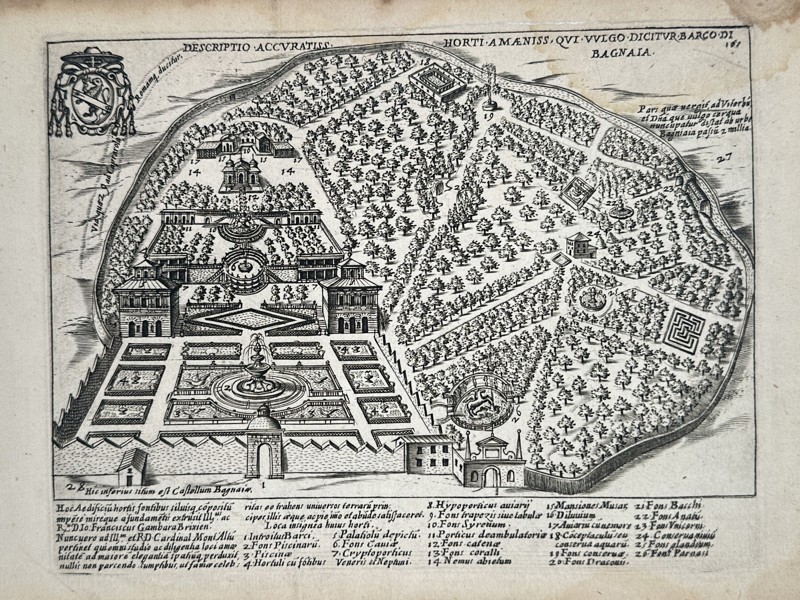 This engraving depicts a detailed bird's-eye view of the renowned Renaissance garden of Villa Lante in Bagnaia, described in the title as the Barco di Bagnaia. The composition illustrates the harmonious integration of formal garden design and natural woodland, featuring symmetrical parterres, cascading water features, and the two identical palazzine that define the estate. A decorative coat of arms is situated in the upper-left corner, while the lower section contains an extensive numbered legend identifying twenty-six specific architectural and botanical highlights, including various fountains and themed groves. This work was published as part of the Antiquae Urbis Splendor, an influential series of prints intended to document and celebrate the architectural and topographical grandeur of Rome and its significant suburban villas.