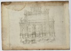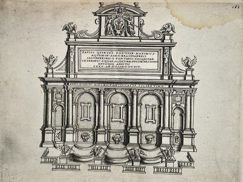 This engraving depicts the monumental Fontana dell'Acqua Paola, also known as Il Fontanone, located on the Janiculum Hill in Rome. The composition features the grand triumphal arch design of the fountain, showcasing its five distinct arched niches, ionic columns, and the large attic story inscribed with a dedication to Pope Paul V. Detailed architectural elements include the papal coat of arms supported by angels at the summit, decorative dragons and eagles flanking the structure, and the large granite basins at the base designed to receive the cascading water. This work was published as part of the Antiquae Urbis Splendor, an influential series of prints intended to document and celebrate the architectural and topographical grandeur of Rome and its significant public monuments.