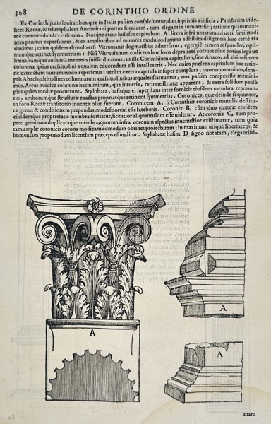 This illustration depicts a technical architectural study of the Corinthian order, featuring a highly detailed capital and its corresponding entablature. The central figure showcases the capital's characteristic double row of acanthus leaves and elegant corner volutes, while the adjacent diagrams provide a profile view of the molded cornice and architrave. Accompanying Latin text provides theoretical and historical context regarding the proportions and origins of these classical elements, emphasizing the geometric precision required for their construction. This work was published as part of I Quattro Libri dell'Architettura, one of the most influential architectural treatises in history, which provided a comprehensive guide to design and construction based on ancient Roman principles.