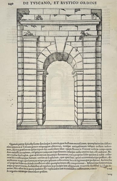 This illustration depicts a technical architectural study of a rustic stone arch, demonstrating the robust characteristics of the Tuscan and Rustic orders. The composition features a central arched portal constructed from large, textured masonry blocks, known as rustication, which create a sense of strength and antiquity. The arch is supported by two massive rectangular pillars and is topped by a simple, heavy entablature that integrates naturalistic botanical details growing from the crevices of the stone. Accompanying Latin text provides theoretical and historical context regarding the proportions and specific use of this style in military and civic architecture, reflecting the artist's dedication to the principles of Vitruvian design. This work was published as part of I Quattro Libri dell'Architettura, one of the most influential architectural treatises in history, which provided a comprehensive guide to design and construction based on ancient Roman principles.