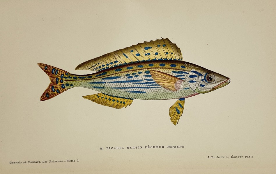 This illustration depicts a naturalistic study of a picarel, identified by the French title Picarel Martin Pecheur. The fish is characterized by its slender body, vibrant yellow fins with blue spots, and blue horizontal markings along its silvery-green flanks. The specimen is presented in a lateral profile against a plain, light background to highlight its anatomical features, including the fine detail of the scales and the sharp rays of the dorsal fin. This work was published as part of Les Poissons: Synonymie, Description, Moeurs, Frai, Peche, an extensive nineteenth-century survey of ichthyology that combined scientific classification with high-fidelity visual documentation.