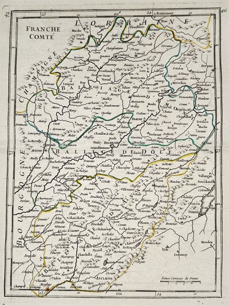 This engraving presents a detailed topographical and administrative map of the Franche-Comte region in eastern France, bordering Lorraine, Champagne, Burgundy, and Switzerland. The composition features the territorial subdivisions of the area, specifically highlighting the Bailliage d'Amont and the Bailliage de Dole, with numerous cities, towns, and villages clearly marked alongside river systems and mountain ranges. The geographical boundaries are accentuated with hand-colored outlines in green and yellow to distinguish between different jurisdictions and neighboring provinces. This illustration was published as a technical plate for a geographical atlas intended to provide accurate cartographic information for administrative and educational use during the mid-eighteenth century.