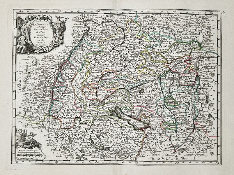 This engraving presents a highly detailed topographical and political map of the Swabian Circle in southwestern Germany, titled La Souabe. The composition features a dense network of territorial boundaries, highlighting numerous duchies, principalities, and free imperial cities such as Wurttemberg, Baden, and Augsburg. The geographical landscape is meticulously rendered with river systems, including the headwaters of the Danube, and shaded relief for mountainous regions like the Black Forest. A decorative title cartouche in the upper left corner is flanked by allegorical figures, while a smaller scale cartouche with cherubs occupies the lower left. Territorial borders are accentuated with varied hand-colored outlines in red, green, yellow, and blue to distinguish the complex overlapping jurisdictions of the Holy Roman Empire. This illustration was published as a technical plate for a geographical atlas intended to provide accurate cartographic and political information during the mid-eighteenth century.
