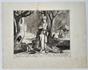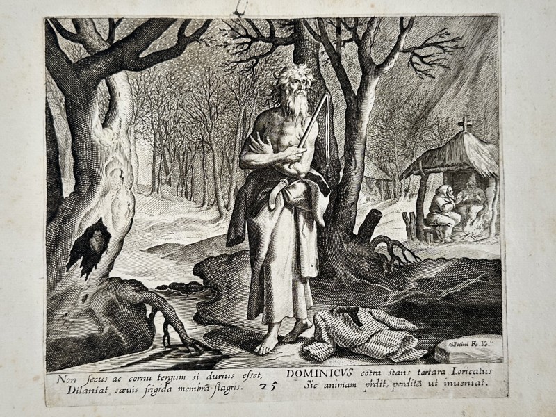 This engraving depicts the ascetic medieval monk Saint Dominic Loricatus standing in a desolate, wintery forest. He is shown holding a discipline, a small whip used for self-flagellation, which reflects his reputation for extreme penance and physical austerity. In the background, a small thatched hermitage is visible, where another monk is seen seated by a fire, providing a narrative contrast between the interior life of the monastery and the solitary struggle of the hermit. The landscape is characterized by bare, gnarled trees and a rugged terrain rendered with fine hatching to emphasize the cold and harsh environment. This illustration served as a devotional print intended to provide a visual meditation on the virtues of repentance and spiritual discipline within the context of hagiographic tradition.