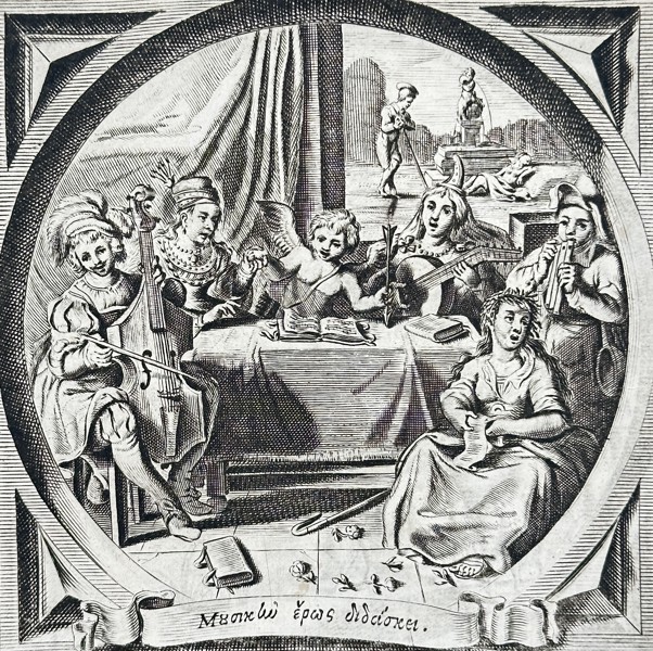 This engraving depicts a moralizing scene of a music lesson, featured within an oval frame as an emblem for the work of Eerlicke Vryagie. The composition shows a group of young men and women gathered around a table in a domestic interior, playing various string and wind instruments while singing from open songbooks. In the background, a small window reveals a secondary scene of a couple strolling in a garden, reinforcing the theme of courtship. The illustration is accompanied by extensive multilingual text in Dutch, Latin, Italian, and French, including the Dutch heading Liefde leert singen / Oock sonder dwingen, which suggests that love inspires harmony and music without the need for force. This work served as a technical plate within an emblem book intended to provide moral and social instruction on the nature of honorable courtship and the civilizing influence of the arts.