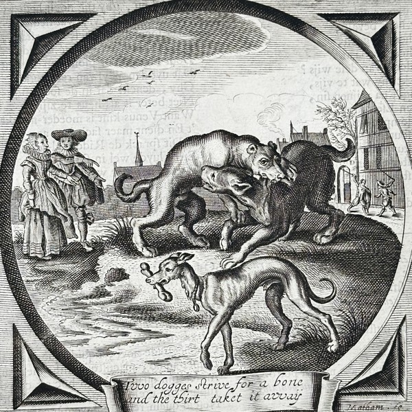 This engraving depicts a moralizing scene centered on three dogs in a dispute over a bone, featured within an oval frame for the work of Eerlicke Vryagie. The primary composition shows two larger dogs fighting in the foreground while a third, smaller dog seizes the opportunity to run off with the bone. In the background, a couple in contemporary seventeenth-century attire observes the event from the edge of an urban street. The illustration is accompanied by extensive multilingual text, including the English heading Two dogges strive for a bone, and the third taket it away, which serves as a cautionary metaphor for how a third party can benefit from the unnecessary conflicts of others. This work served as a technical plate within an emblem book intended to provide moral and social instruction through the combination of animal allegory and pithy sententiae regarding human behavior and social dynamics.