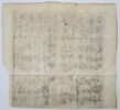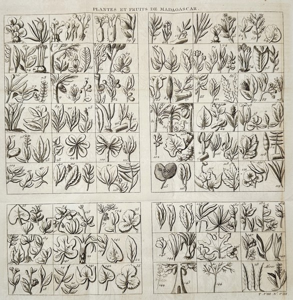 This engraving presents an extensive botanical survey of the diverse flora of Madagascar, titled Plantes et Fruits de Madagascar. The composition is organized into four large rectangular grids, each subdivided into smaller cells containing individual illustrations of leaves, flowers, and fruits. This intricate plate was featured in the monumental Histoire Generale des Voyages and served as a technical reference for eighteenth-century naturalists to identify and study exotic plant species documented during global maritime expeditions. The work reflects the Enlightenment era's systematic approach to recording the natural history of recently explored territories.
