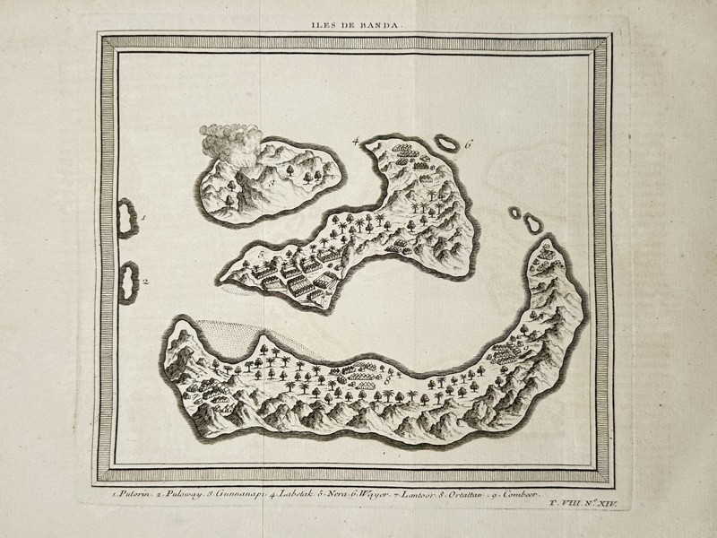 This engraving presents a topographical map of the Banda Islands in the Maluku archipelago, titled Iles de Banda. The composition illustrates the volcanic island group, highlighting the central smoking peak of Gunung Api alongside the neighboring islands of Neira and Lontor. The map depicts various settlements, fortresses, and dense groves of nutmeg trees, which were the primary source of the region's wealth and global significance. A numbered key at the bottom identifies nine specific geographical locations, including Pulo-rin, Neira, and Ortaltaan, facilitating a technical understanding of the island's layout. This illustration was featured in the monumental Histoire Generale des Voyages and served as an essential visual reference for eighteenth-century readers to locate the strategic centers of the Dutch spice trade in the East Indies.