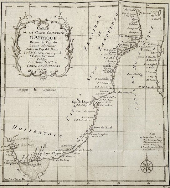 This engraving presents a detailed maritime chart of the southeastern coastline of Africa, titled Carte de la Coste Orientale d'Afrique. The geographical scope extends from the Cape of Good Hope in the south to Cape Delgado in the north, encompassing the territories of the Hottentots, Natal, Cafrerie, and the coast of Mozambique. The map illustrates coastal features such as bays, inlets, and river mouths, alongside the significant Canal de Mozambique and the island-dotted waters of Zanguebar. An ornate decorative cartouche in the upper left corner provides the title and states that the map was published by order of the Count of Maurepas in 1740. This illustration was featured in the monumental Histoire Generale des Voyages and served as a technical reference for eighteenth-century readers to visualize the strategic sea routes and colonial outposts along the Indian Ocean.