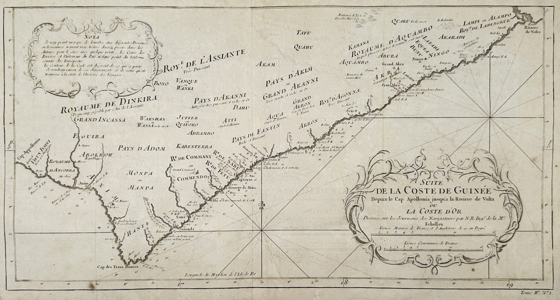 This engraving presents a detailed maritime and territorial chart of the West African coastline, titled Suite de la Coste de Guinee Depuis le Cap Apollonia jusqu'a la Riviere de Volta ou La Coste d'Or. The geographical scope covers the Gold Coast, illustrating the various sovereign territories and kingdoms of the interior, including the Royaume de Dinkira, the Pays d'Akanni, and the Roy de l'Assiante. The map meticulously details coastal features, river mouths, and European trading forts situated along the Gulf of Guinea. An ornate decorative cartouche in the lower right provides the title and indicates that the chart was drawn from the journals of navigators by the royal hydrographer. A second cartouche in the upper left contains a technical note regarding the geographical coordinates and the reliability of different source materials used in the map's construction. This illustration was featured in the monumental Histoire Generale des Voyages and served as an essential reference for eighteenth-century readers to visualize the complex political and commercial landscape of the African coast during the height of the transatlantic trade.