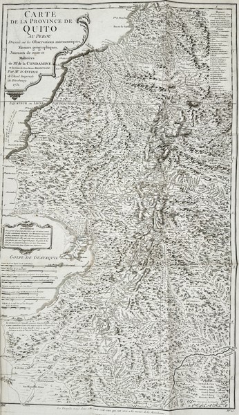 This engraving presents a comprehensive topographical map of the South American region surrounding the city of Quito, titled Carte de la Province de Quito au Perou. The composition provides a detailed survey of the Andes mountain range, illustrating numerous peaks, volcanic ranges, and river systems that flow toward the Pacific coast and the Amazon basin. The map depicts major settlements, administrative divisions, and significant coastal features such as the Golfe de Guayaquil and the Equateur ou Ligne Equinoctiale. A large decorative cartouche in the upper left corner states that the work was drawn from astronomical observations and geographical measurements made by members of the French Geodesic Mission, including Charles Marie de La Condamine. This illustration served as a technical reference for eighteenth-century readers to understand the complex geography and scientific exploration of the Spanish colonial territories in South America.
