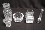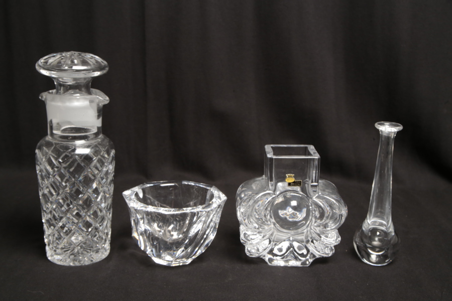 1st Orrefors skål: (H= 9cm) (Dia= 12cm)1st Orrefors vas: (H= 18cm) Dia= 5cm)1st Gullaskruf vas: (H= 14cm) (B= 13cm)1st Karaff: (H= 24cm) (Dia= 10cm)