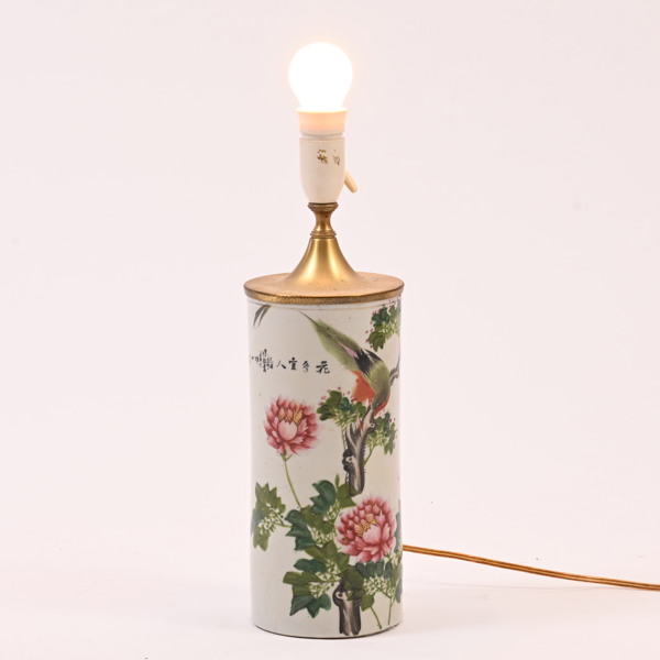 1900-tal, dekor i emaljfärger, montering i mässing, höjd inkl lampsockel 43 cm