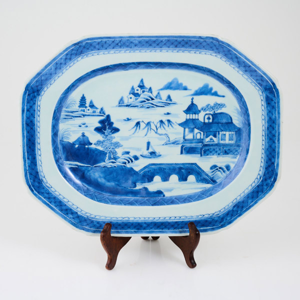 Dekor i underglasyrblått med pagodlandskap, 36x28 cm