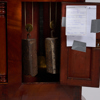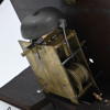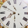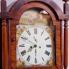 Fanérat med mahogny, slag, bemålad urtavla, höjd 218 (huv utan dekorelement), lod, pendel, vev medföljer