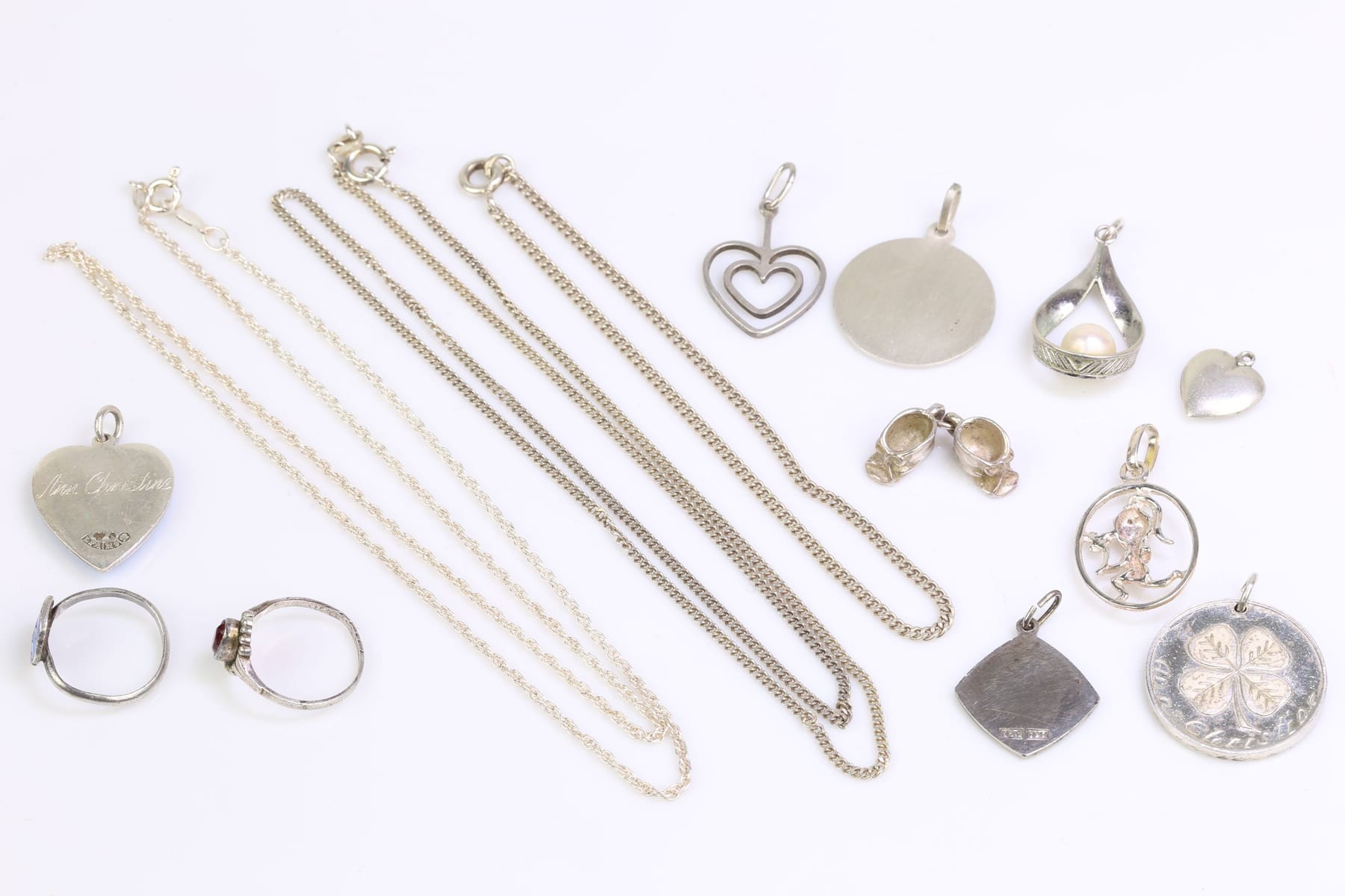 HALSKEDJOR, två st, armband, hängen, nio st, samt ringar, två st, silver