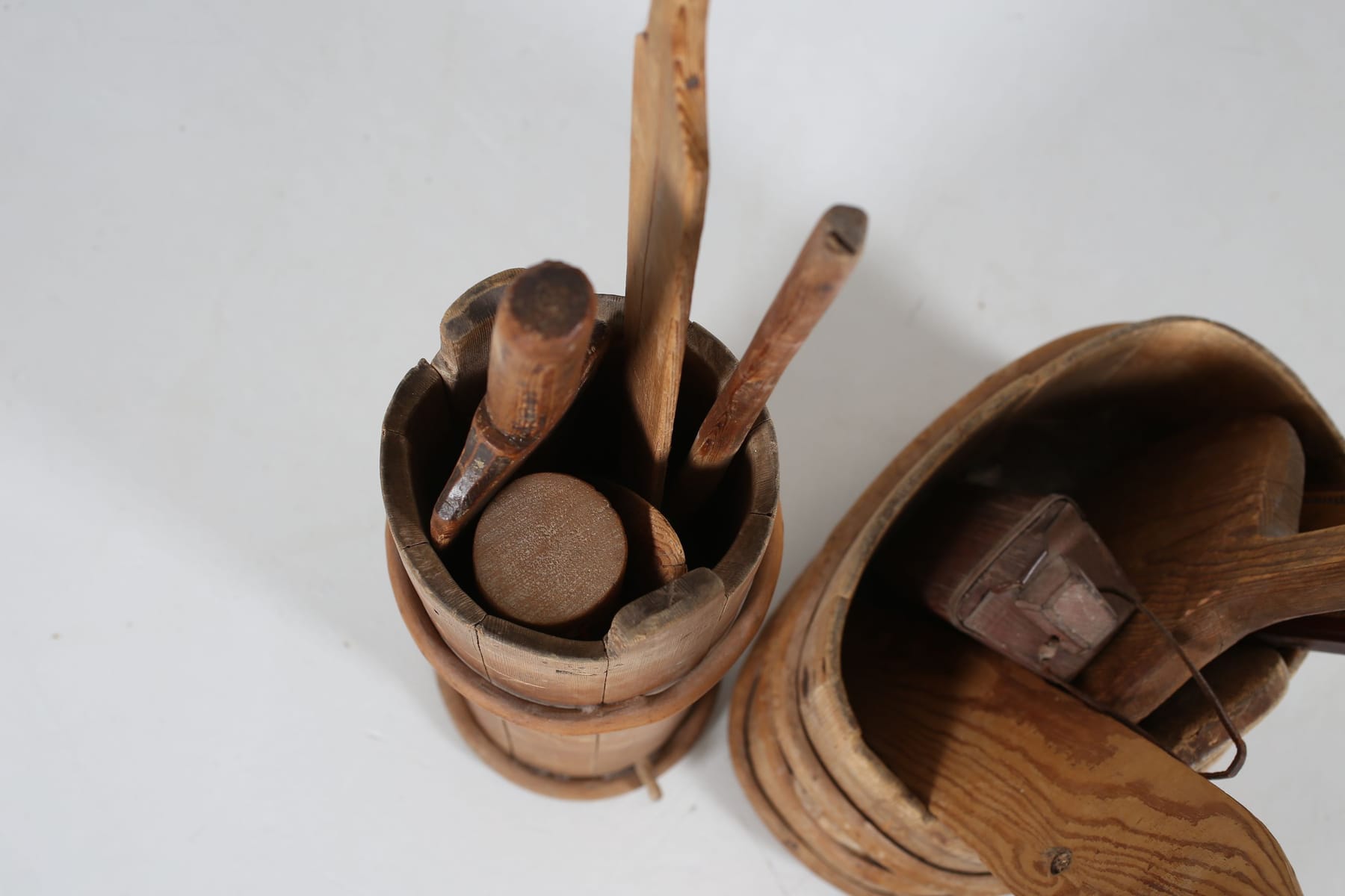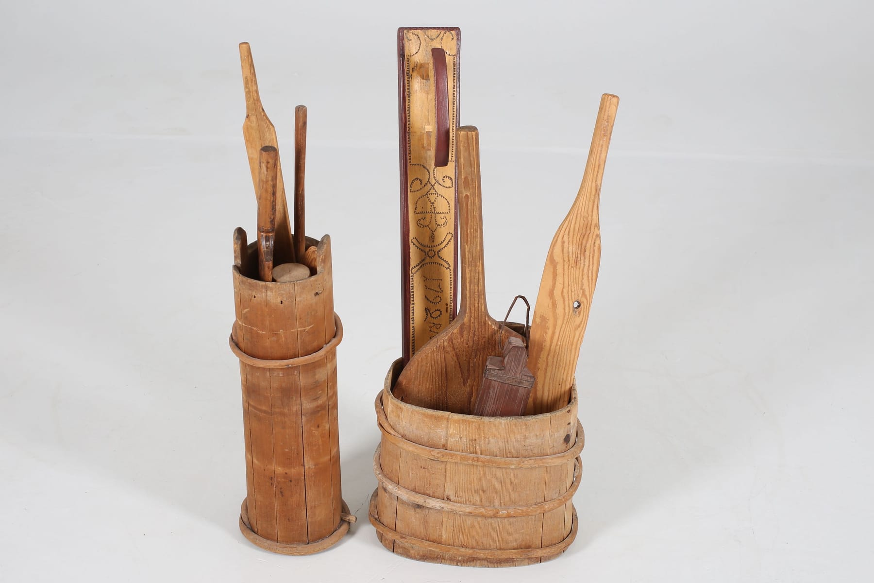 Bilder DIVERSE ALLMOGEFÖREMÅL, bl.a smörkärna, klappträn