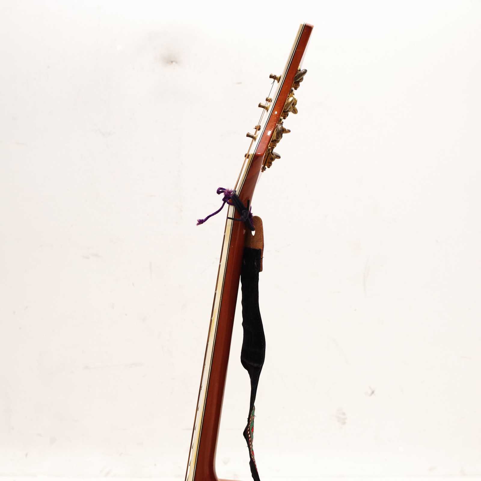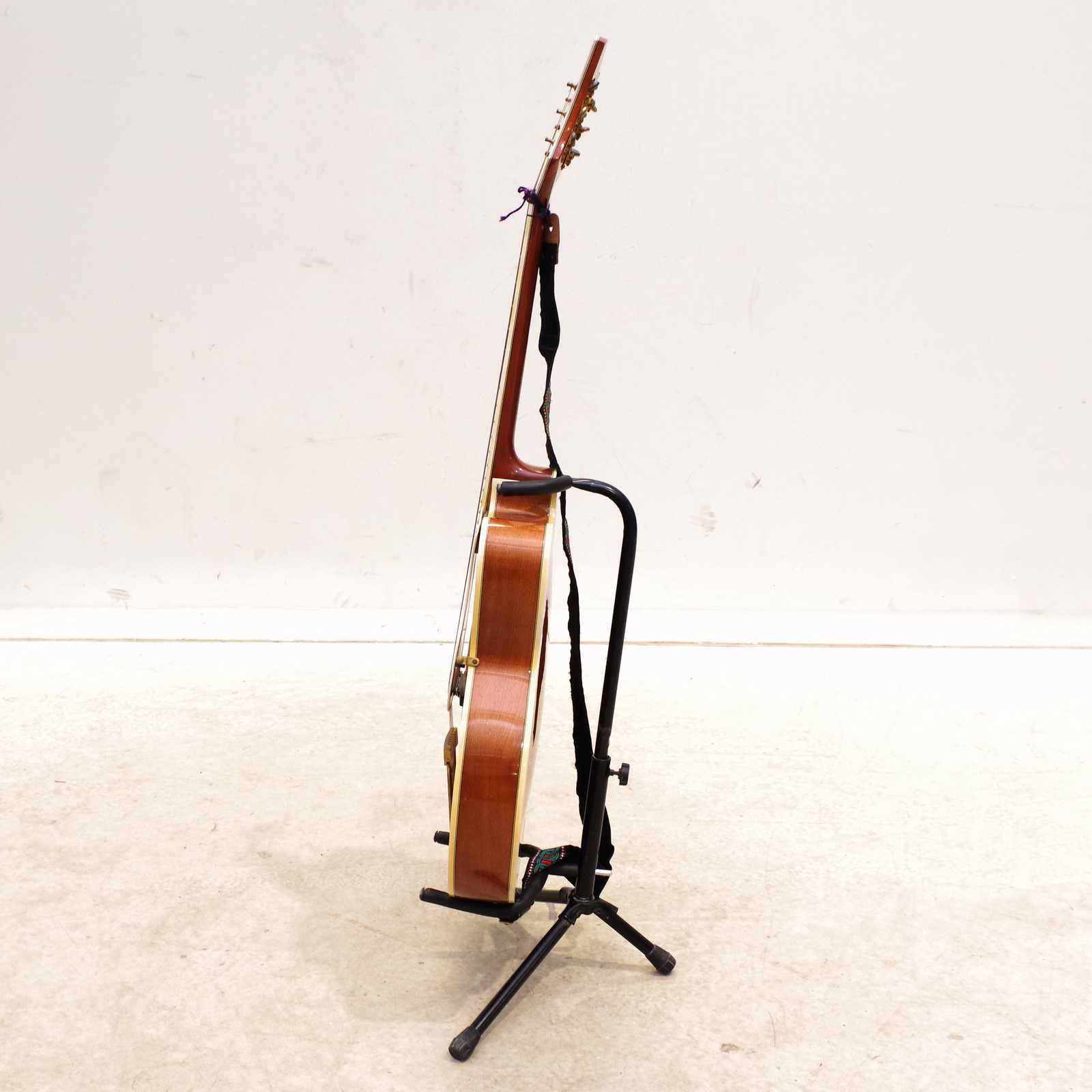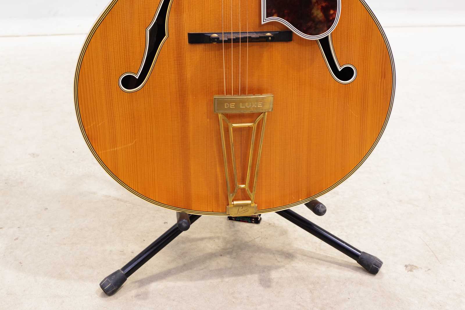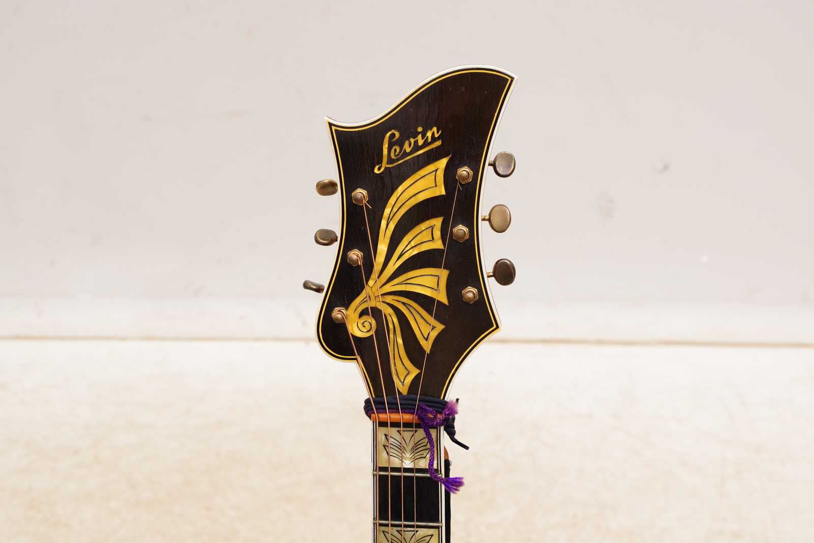 Bilder HERMAN CARLSON LEVIN. DELUXE, gitarr, 1949, fodral medföljer. Serienummer 215105. 2st strängar saknas. Påbörjad spricka på baksidan, annars bra skick.