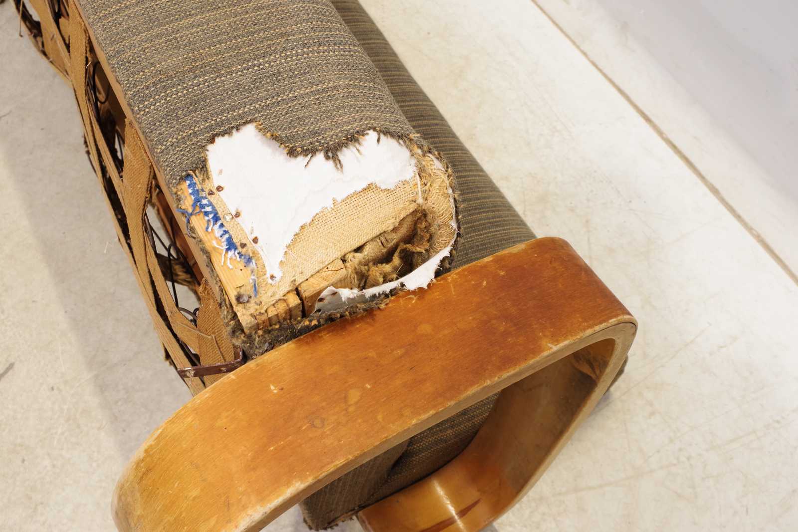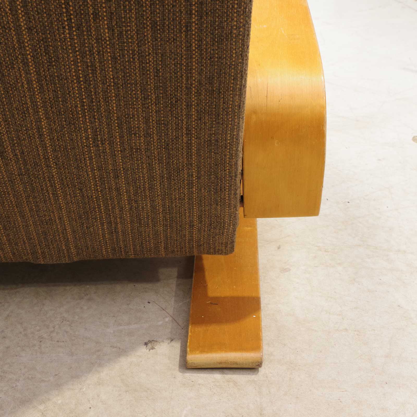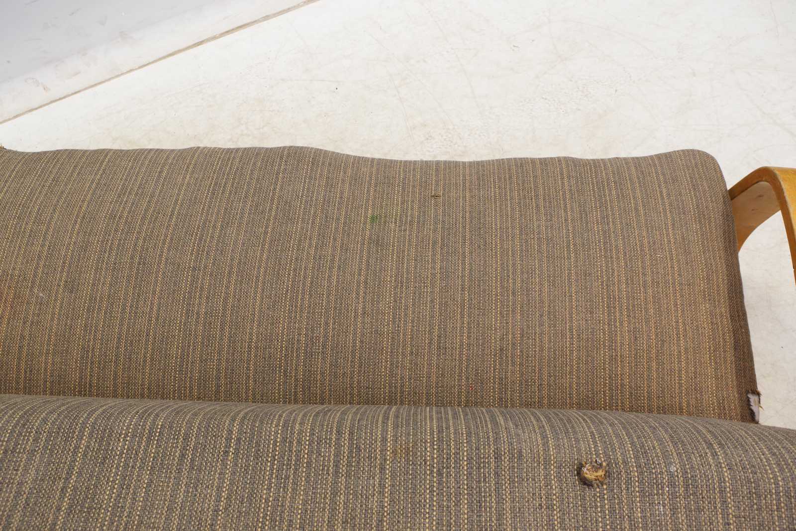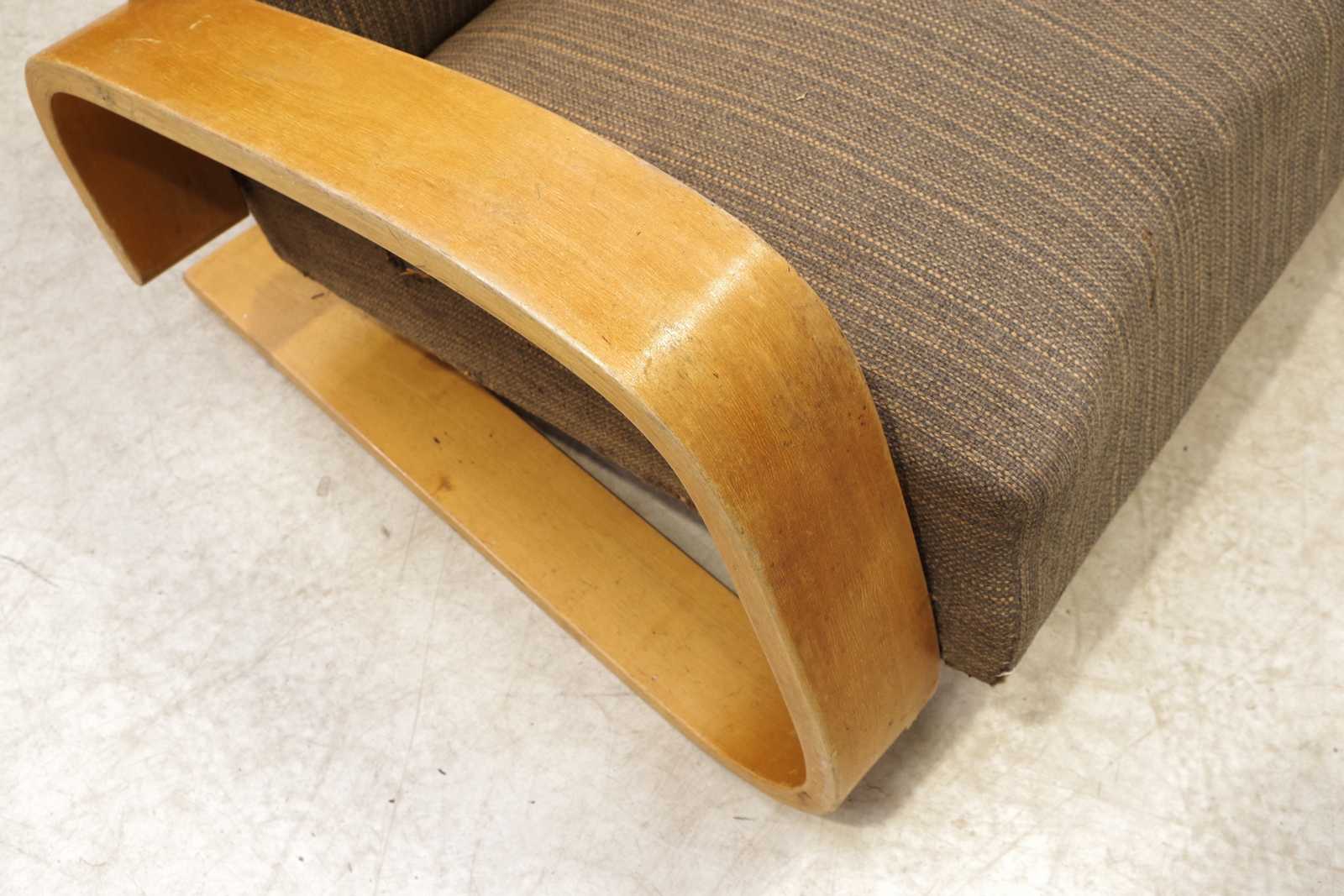 Bilder ALVAR AALTO. Soffa, modell 38 "Tank", Oy Huonekalu ja Rakennustyötehdas AB, laminerad björk, 1930-tal. Formgiven 1936. Skador klädsel, smådefekter stomme, fjädrar ej genomgångna, se extrabilder. Bredd: 173cm