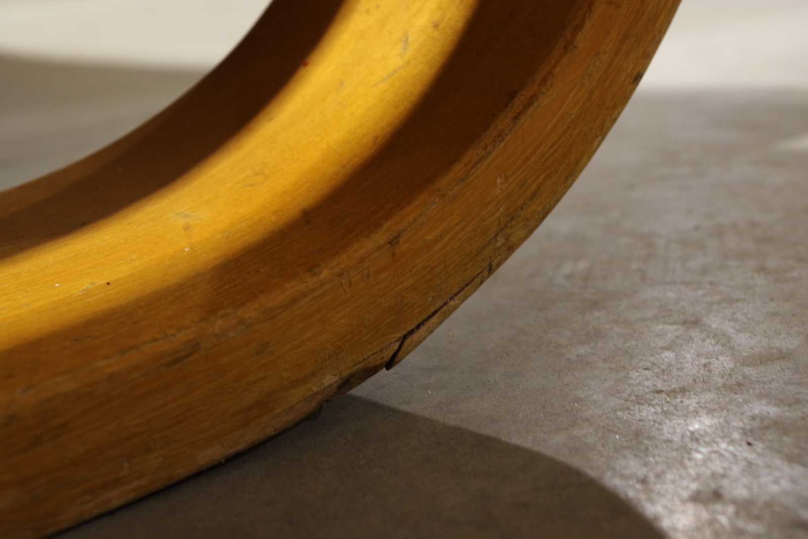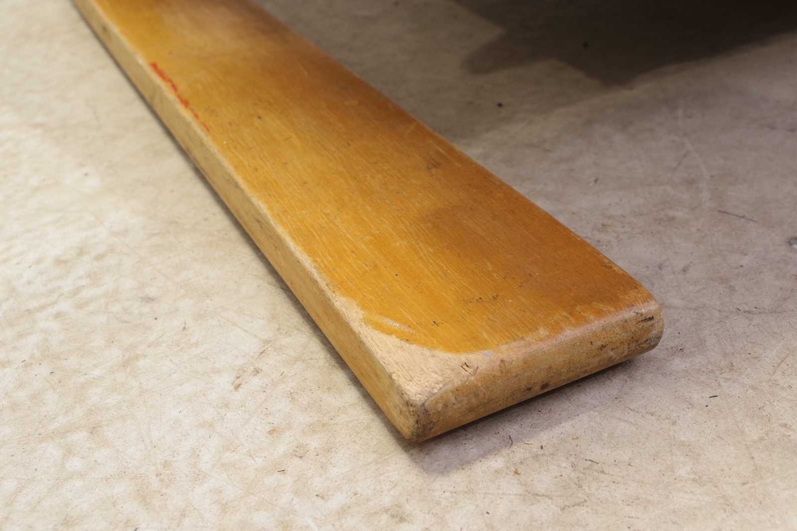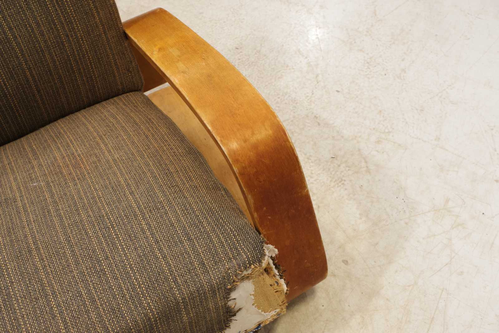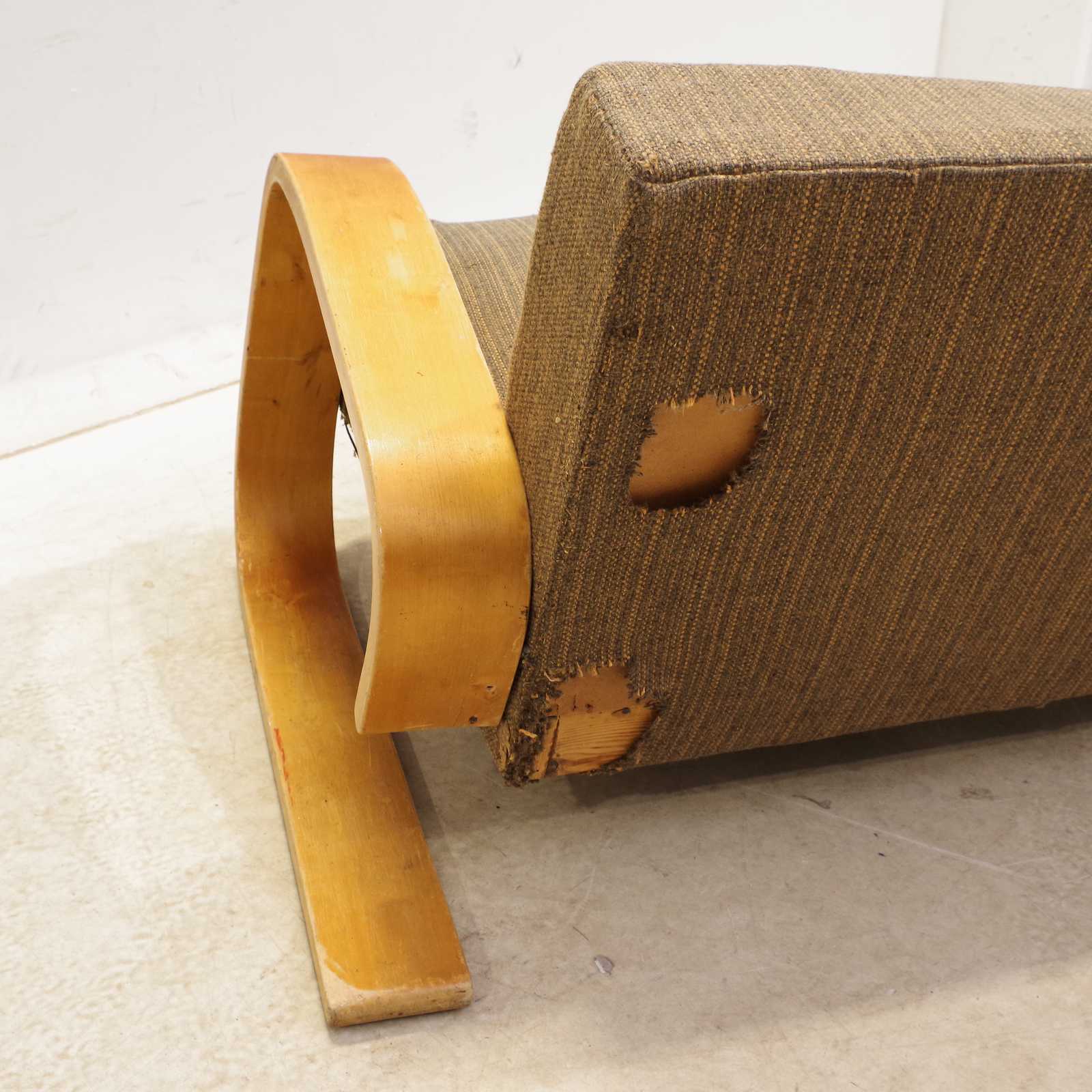 Bilder ALVAR AALTO. Soffa, modell 38 "Tank", Oy Huonekalu ja Rakennustyötehdas AB, laminerad björk, 1930-tal. Formgiven 1936. Skador klädsel, smådefekter stomme, fjädrar ej genomgångna, se extrabilder. Bredd: 173cm