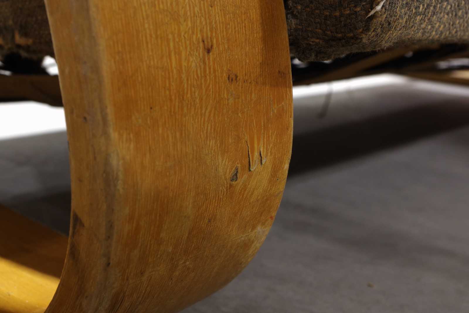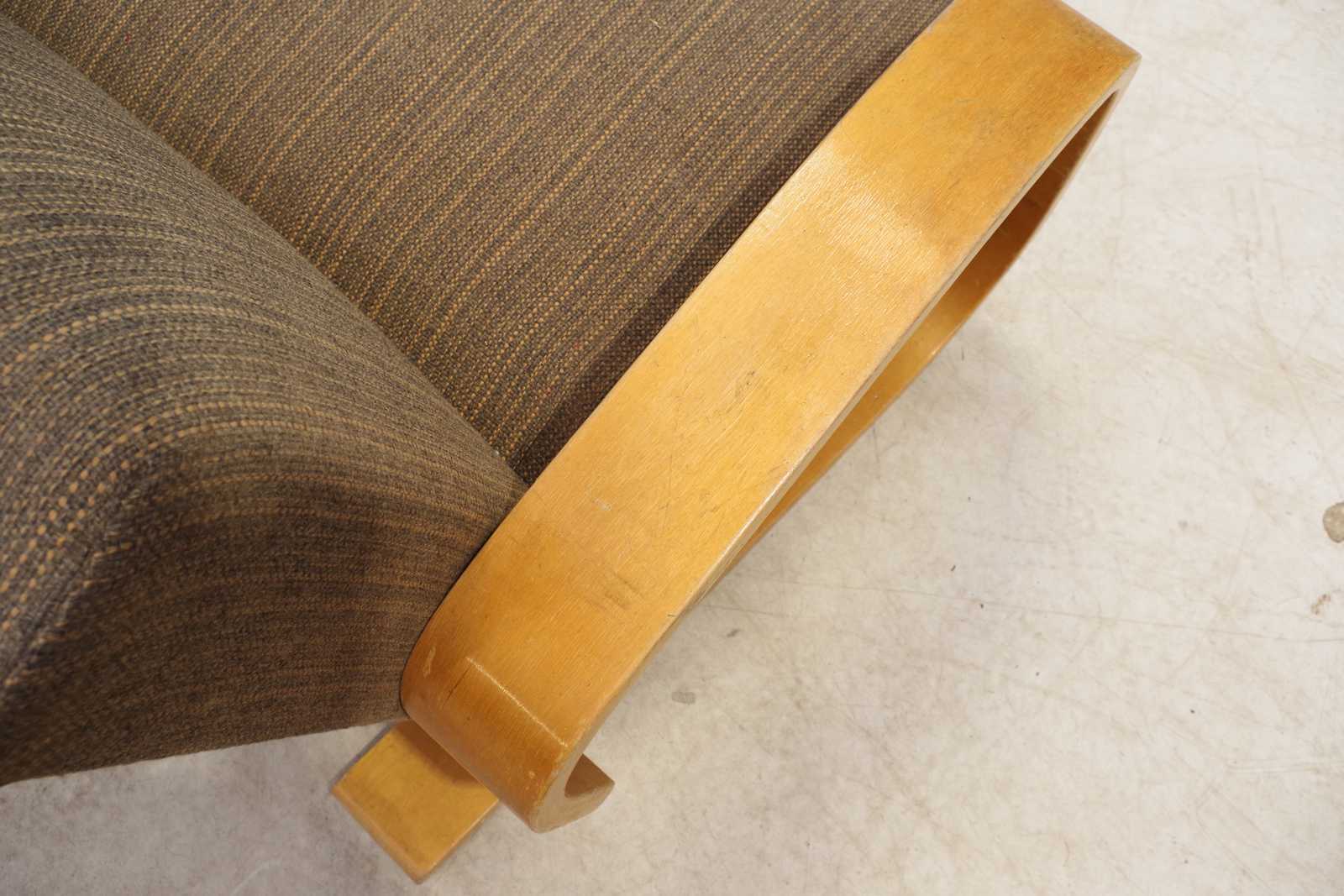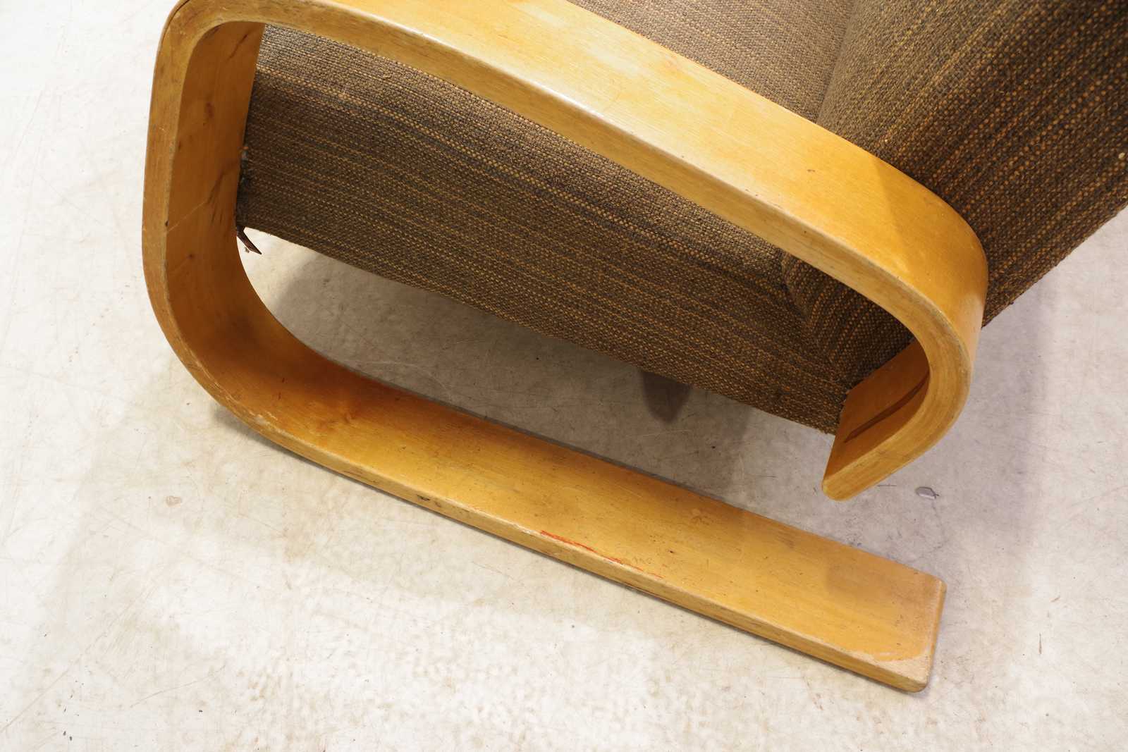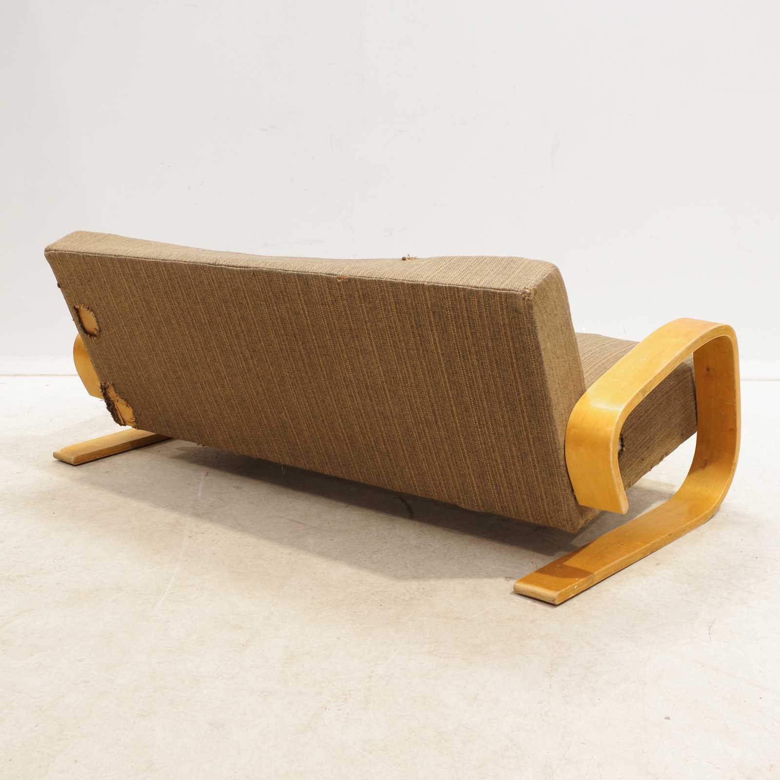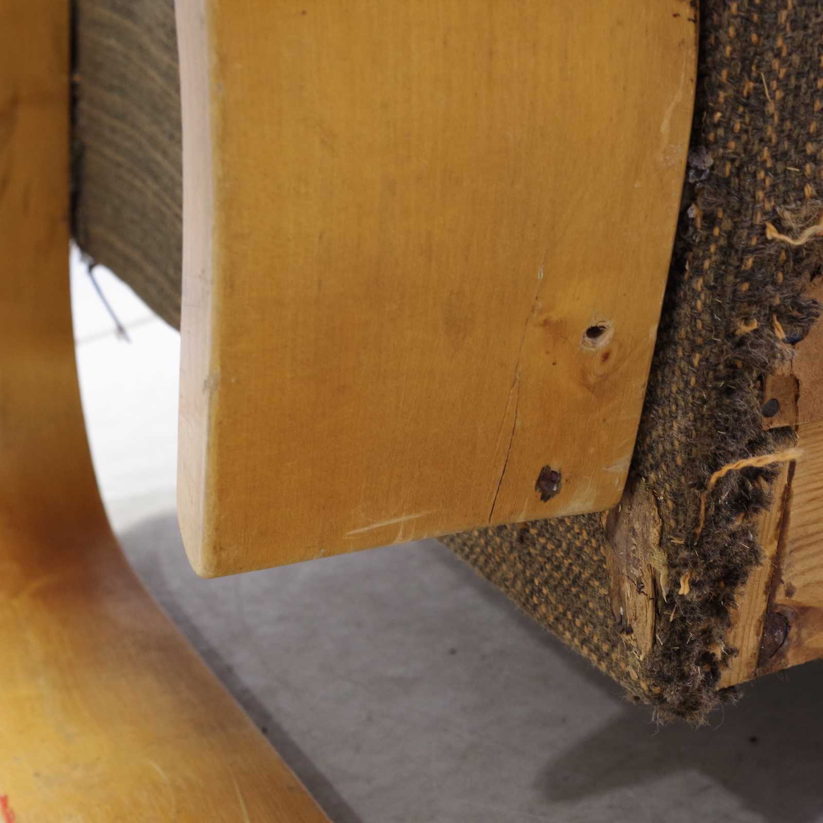 Auktioner ALVAR AALTO. Soffa, modell 38 "Tank", Oy Huonekalu ja Rakennustyötehdas AB, laminerad björk, 1930-tal. Formgiven 1936. Skador klädsel, smådefekter stomme, fjädrar ej genomgångna, se extrabilder. Bredd: 173cm