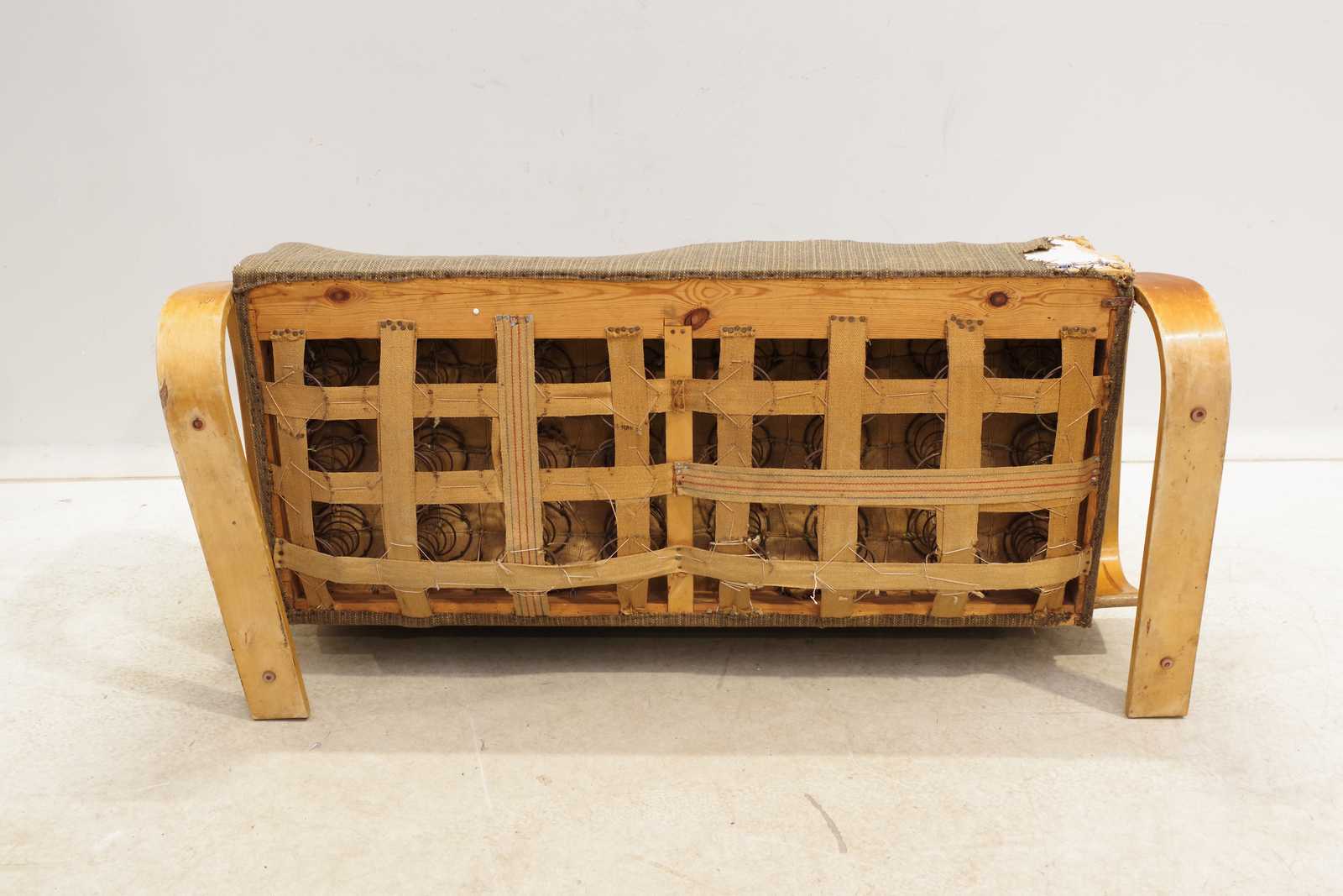ALVAR AALTO. Soffa, modell 38 "Tank", Oy Huonekalu ja Rakennustyötehdas AB, laminerad björk, 1930-tal. Formgiven 1936. Skador klädsel, smådefekter stomme, fjädrar ej genomgångna, se extrabilder. Bredd: 173cm