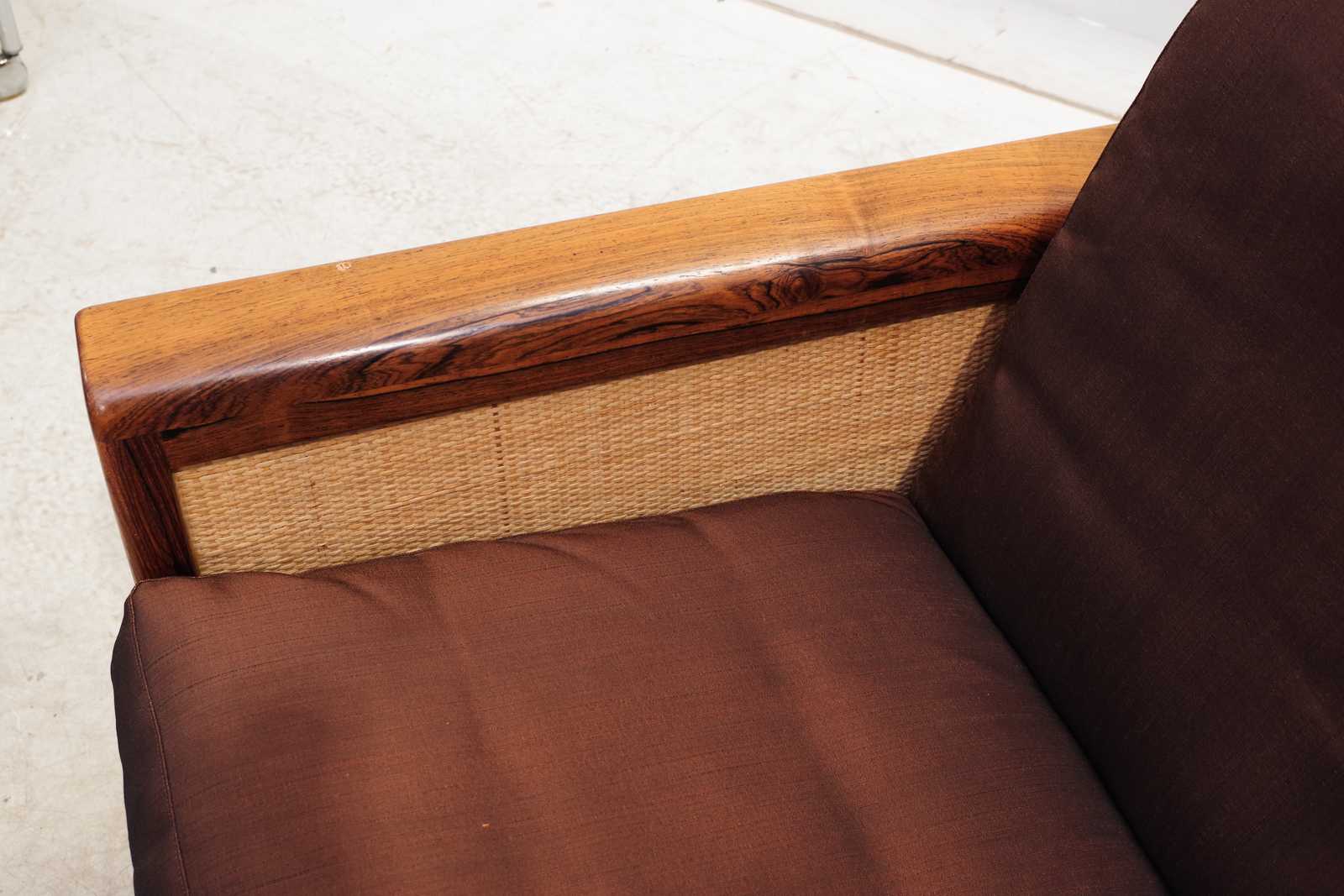 Bilder FÅTÖLJER ett par, Vatne möbler, Norge, 1900-talets tredje kvartal. Stommar av jakaranda, Armlän med flätad rotting. Lösa sitt- och ryggdynor. Brickmärkta. CITES-Intyg medföljer. Exporttillstånd krävs för export utanför EU.