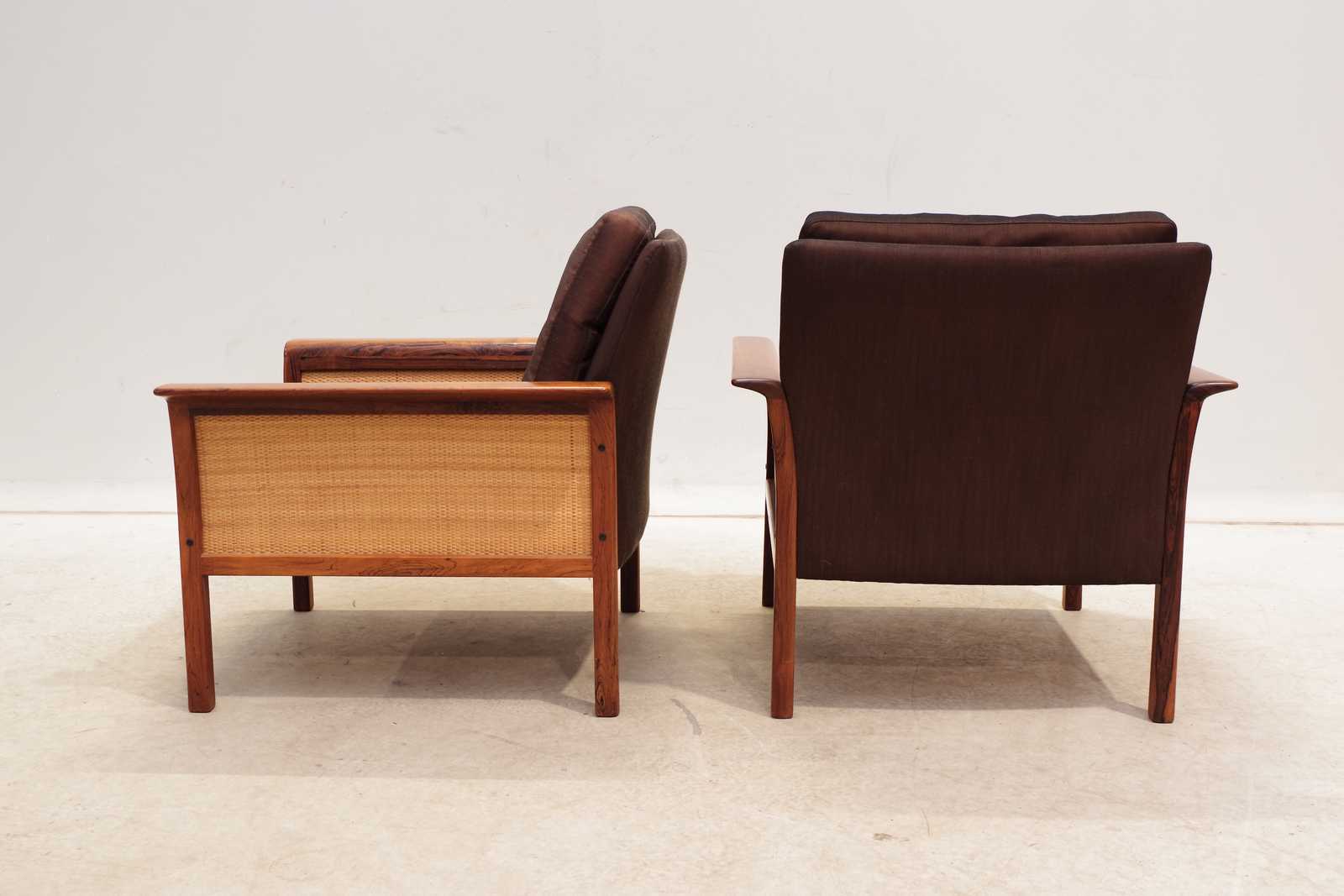 FÅTÖLJER ett par, Vatne möbler, Norge, 1900-talets tredje kvartal. Stommar av jakaranda, Armlän med flätad rotting. Lösa sitt- och ryggdynor. Brickmärkta. CITES-Intyg medföljer. Exporttillstånd krävs för export utanför EU.