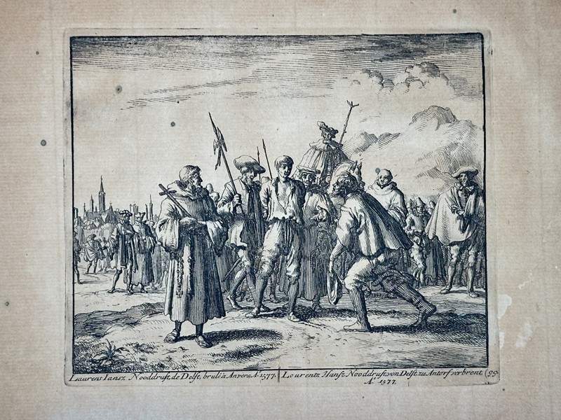 This historical illustration depicts the public execution of Laurens Jansz. Nooddruft, an Anabaptist who was burned at the stake for his religious beliefs in Antwerp in 1577. The composition features a central group of figures, including a condemned man being led toward the place of execution, surrounded by a crowd of soldiers, monks, and onlookers. In the background, a large pyre is visible, and the silhouette of a city with prominent spires suggests the urban setting of the event. The scene captures the somber atmosphere of a public martyr’s death, utilizing detailed linework to emphasize the emotional reactions of the various participants.