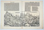 This striking woodcut shows a double cityscape of Bamberg (BAMBERGA) and the fictional Mons Honagorum, printed on folio CLXXV of Hartmann Schedel’s famous Liber Chronicarum, known as the Nuremberg Chronicle. The richly illustrated city view features churches, bridges, towers, and defensive walls rendered in late Gothic style. Set within a Latin text block and printed on both recto and verso, the sheet offers a visually engaging combination of historical narrative and architectural imagery. The work is part of one of the most important incunabula of the 15th century and was published by Anton Koberger in Nuremberg in 1493.