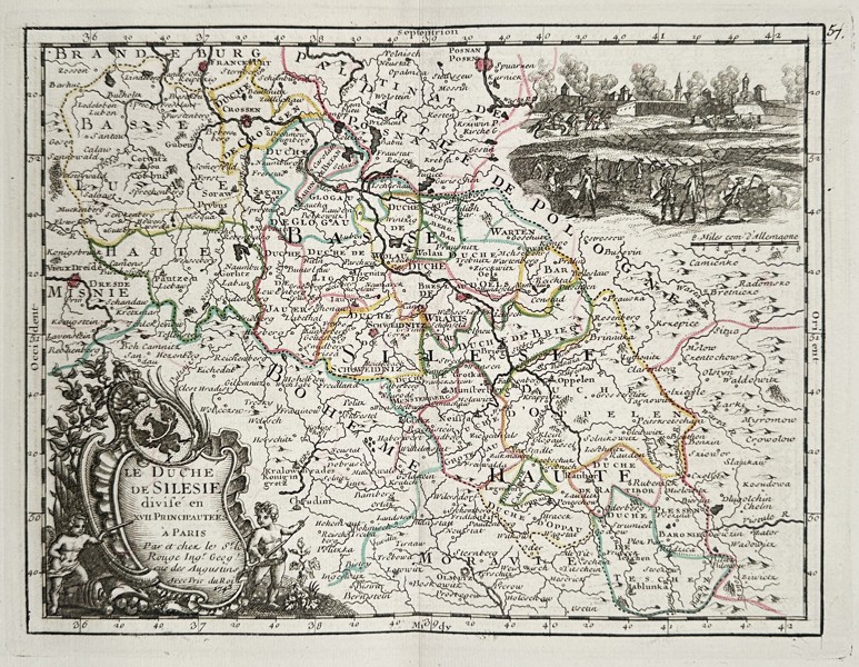 This copperplate engraving is a detailed political map of the Duchy of Silesia, illustrating its division into various principalities and parts, including surrounding regions of Brandenburg, Moravia, and Poland. The map features decorative elements common to the period, including a large, elaborate cartouche adorned with figures and trophies in the corner, and a separate vignette depicting a military scene at the top right. The map uses hand-coloring to delineate the numerous political boundaries, cities, and major river systems.