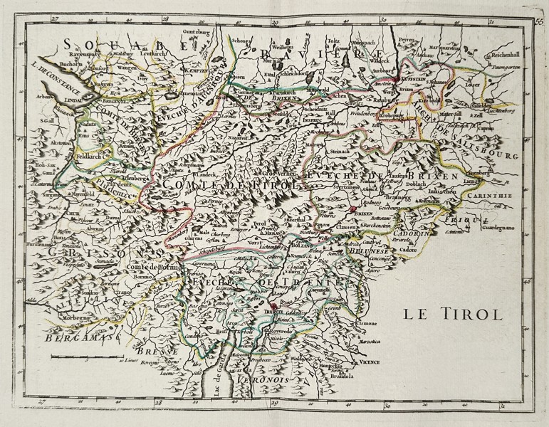 This copperplate engraving is a detailed topographical map of the historical County of Tyrol, a region encompassing parts of modern-day Austria and Italy, labeled "Le Tirol." The map extends its coverage to include portions of surrounding territories such as Bavaria, Swabia, Carinthia, and Lombardy, illustrating political borders, hydrography, and the mountainous terrain that defines the region. The map is partially finished with delicate hand-coloring to distinguish political boundaries.