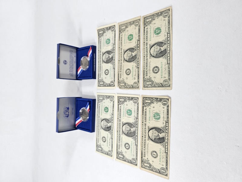 Mynt och sedlar, 2 st half dollar 1986, 5 dollarsedlar, Usa