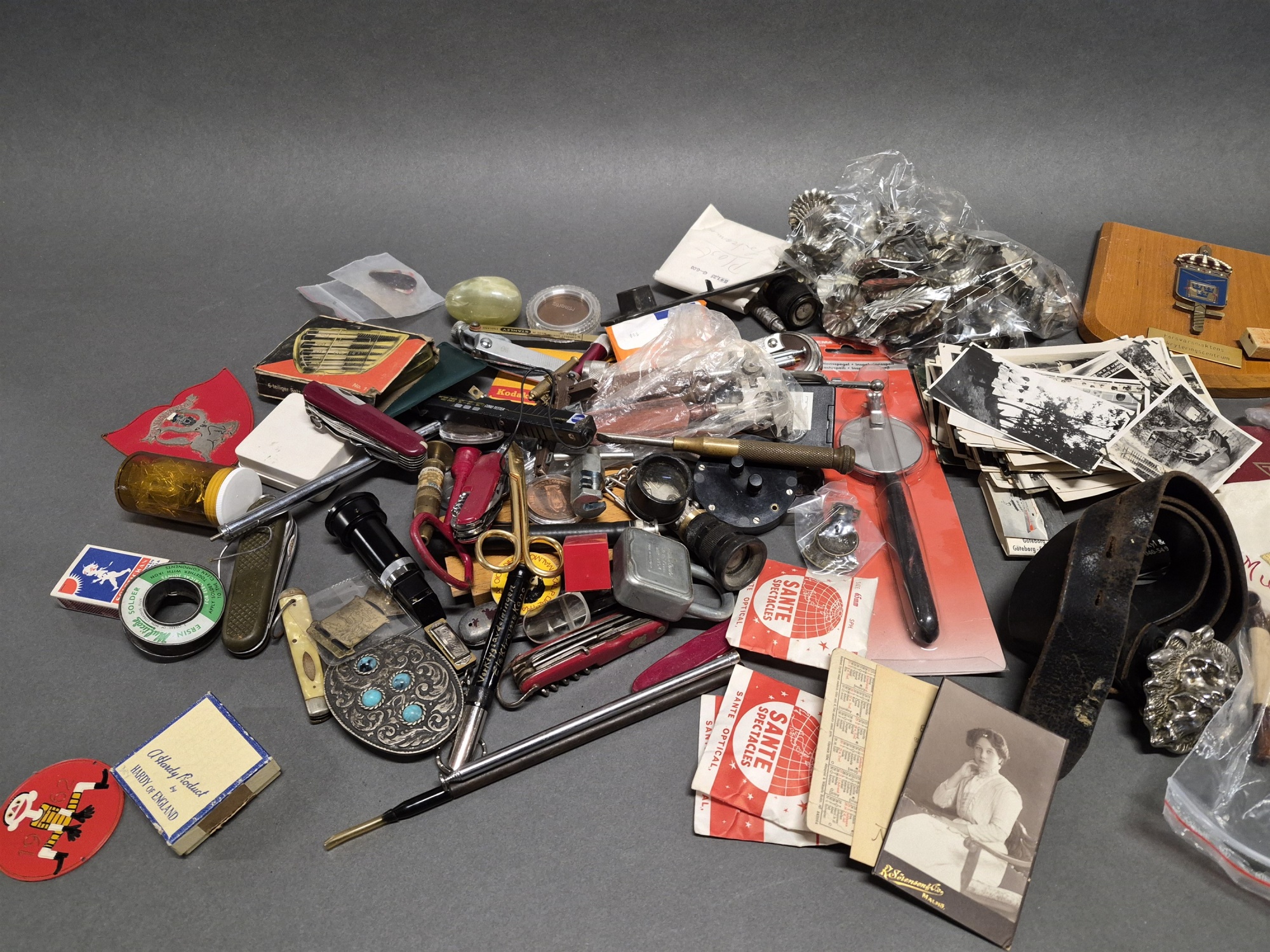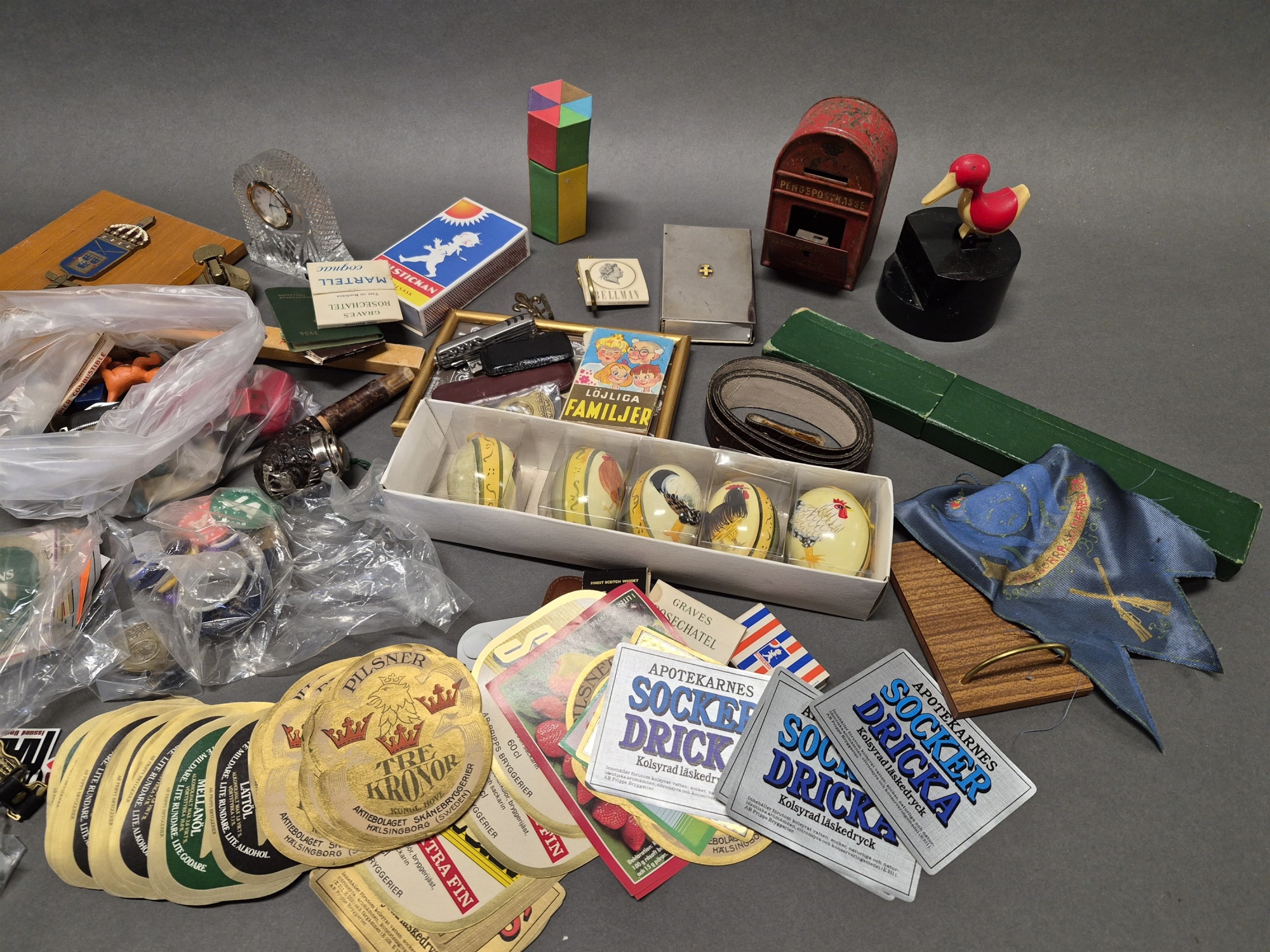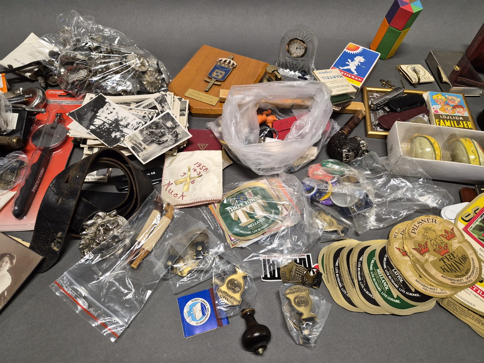 Parti samlarföremål bla läskettiketter och foton, högsta höjd 12 cm