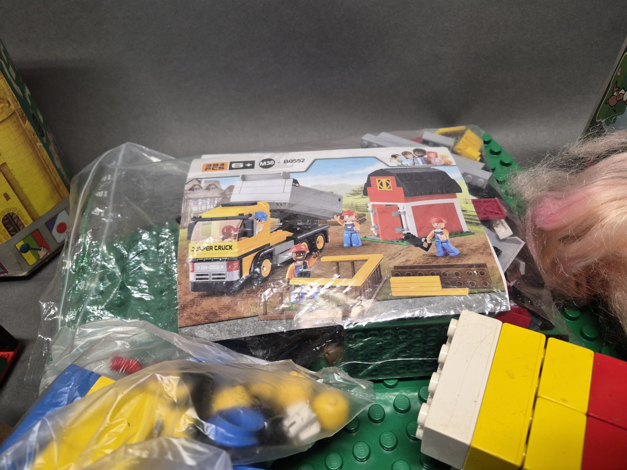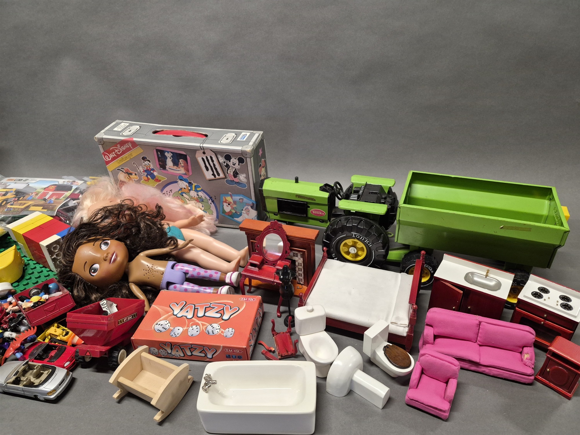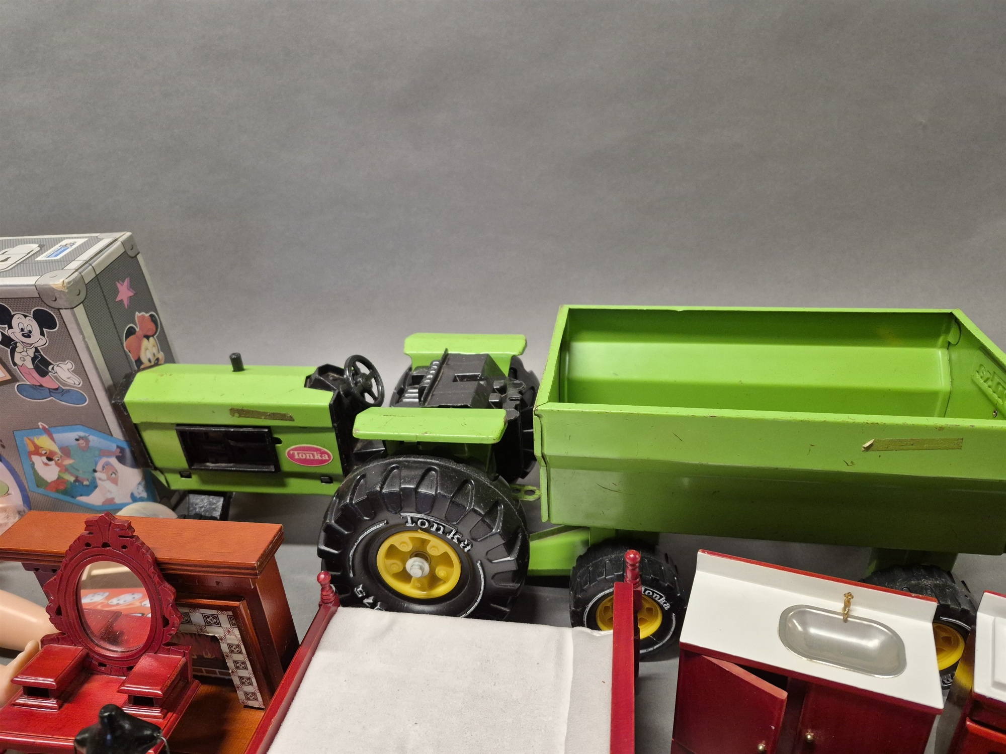 Bilder Parti leksaker bla traktor med släp Tonka, dockmöbler och Titanic, ej genomgånget, högsta höjd 36 cm