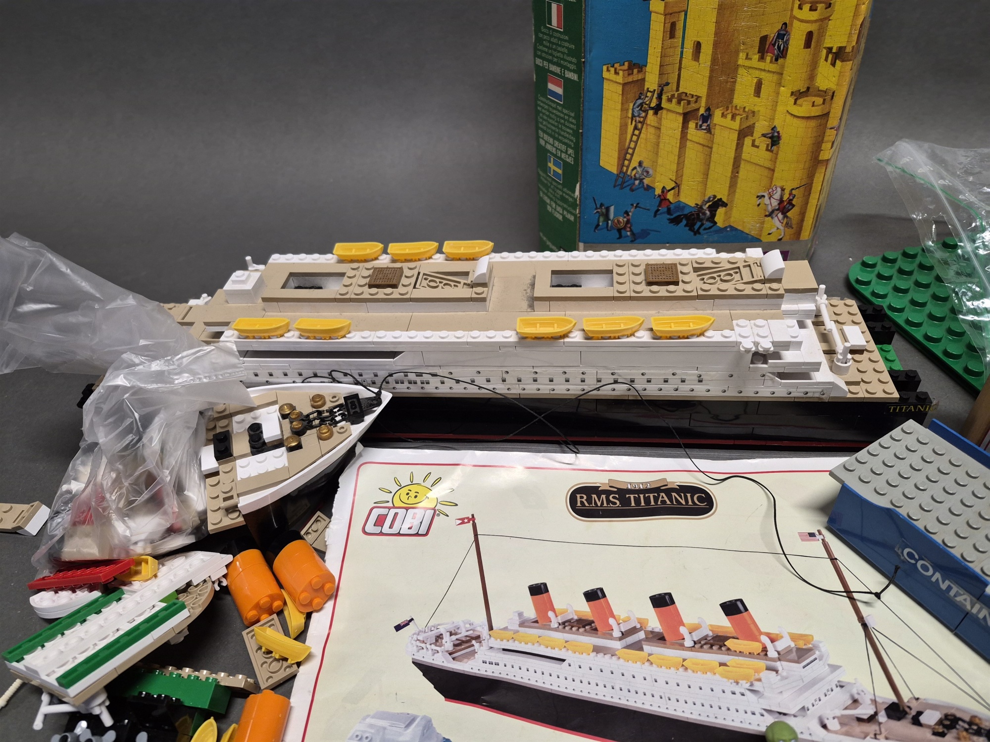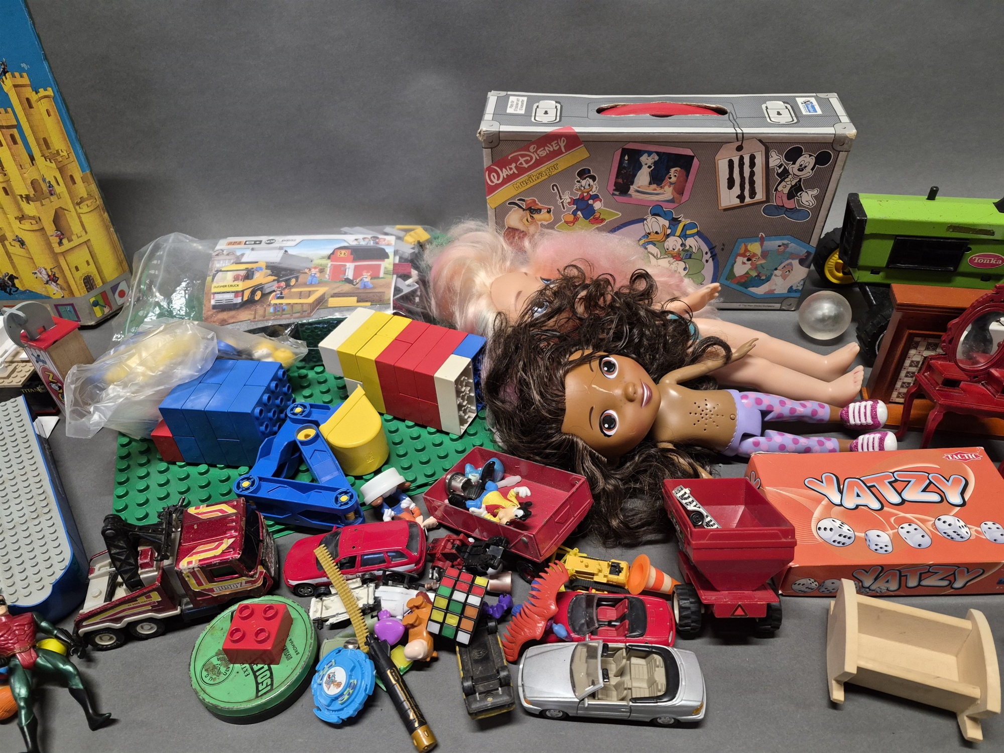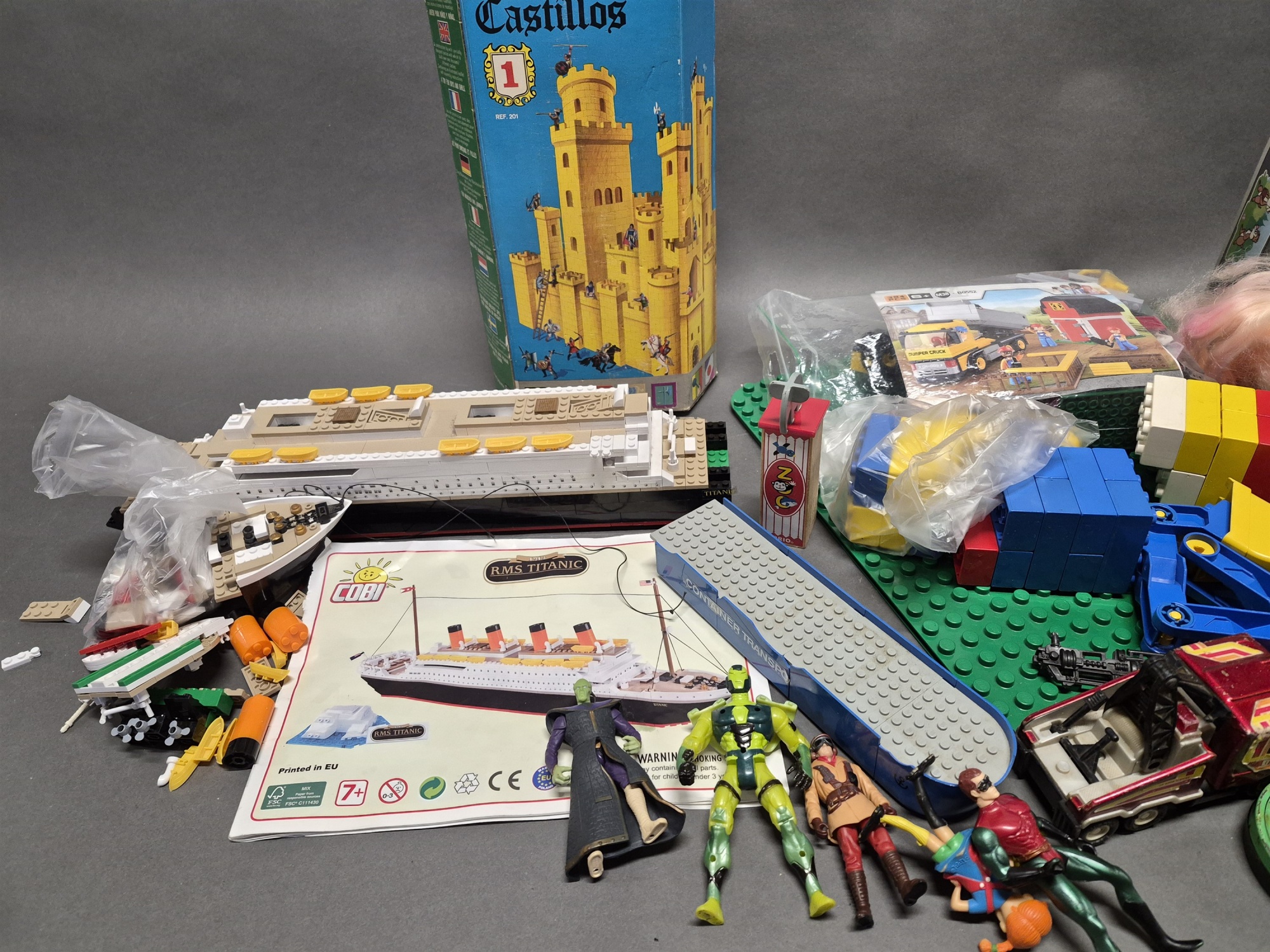 Parti leksaker bla traktor med släp Tonka, dockmöbler och Titanic, ej genomgånget, högsta höjd 36 cm