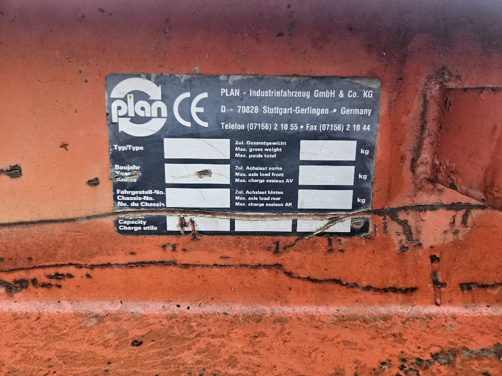 Vagn för att transportera tung-gods inom industrin.Märke/Modell: Plan 10-4Längd: 8 m Bredd: 2 mHöjd: 0,9 mTotalvikt: 39000 kgMax lastvikt: 35000 kg