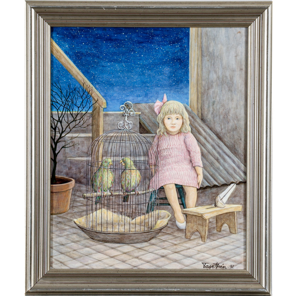 Bilder Tage Åsén, flicka med fågelbur, olja på pannå, signerad