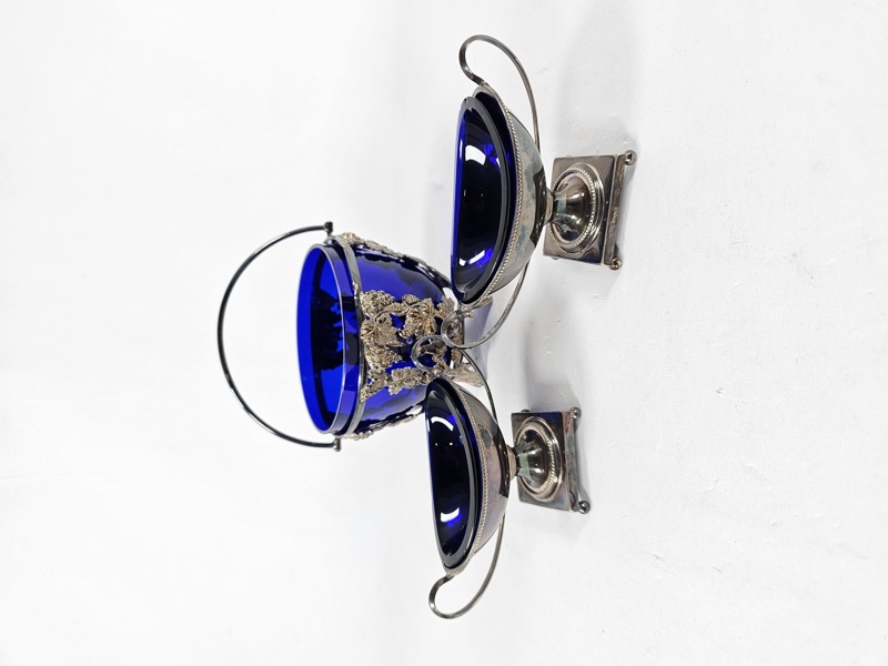 Skål på fot och 2 saltkar m glasinsatser, nysliver.