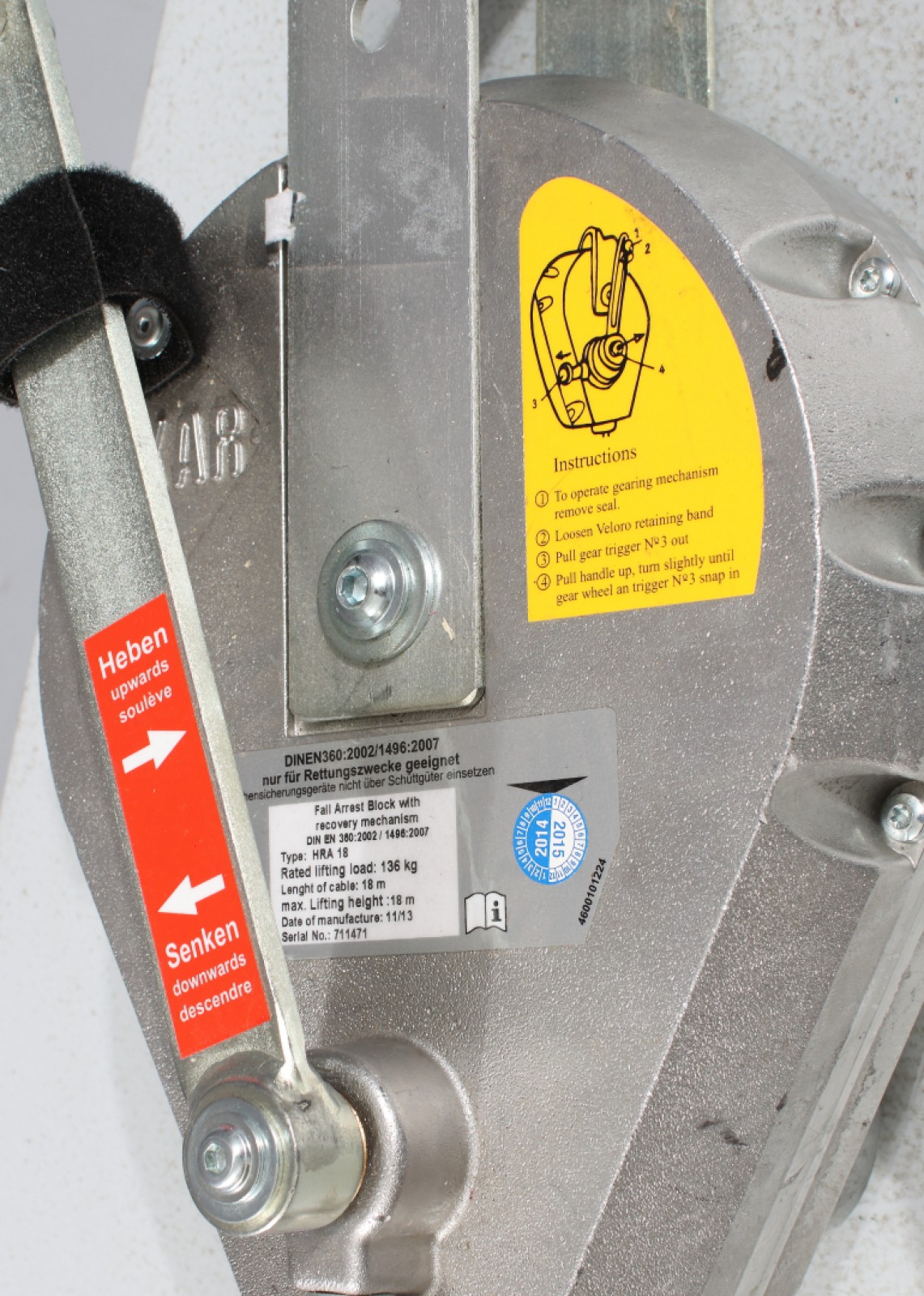 Nyskick, (plombering på kardborreband sitter fortfarande kvar), vajerlängd 18 m, max last 136 kg, butikspris 18715 kr. (vån3)